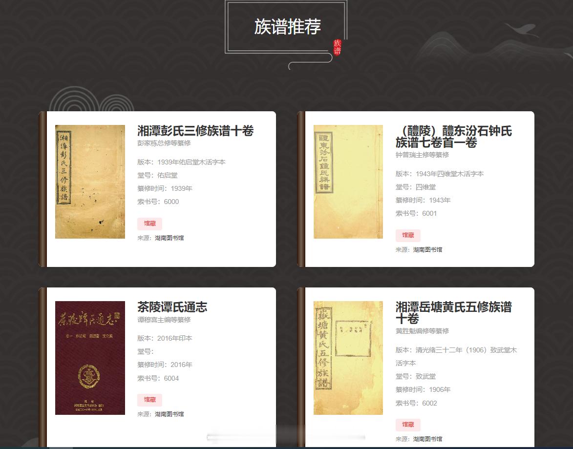 #精选推荐#上海图书馆历史文献自组数字资源推荐——湖南图书馆家谱书目数据库:目前湖南图书馆藏家谱已近七万册,六千余部,涵盖了全省500多个姓氏,家谱藏量位居全国前列,主要以湖南本地姓氏为主,其中名人家谱有魏源、罗泽南、曾国藩、胡林翼、李续宾、杨昌济、毛泽东、刘少奇、彭德怀、黄公略、翦伯赞、周扬、周立波等。