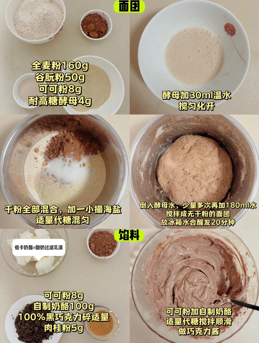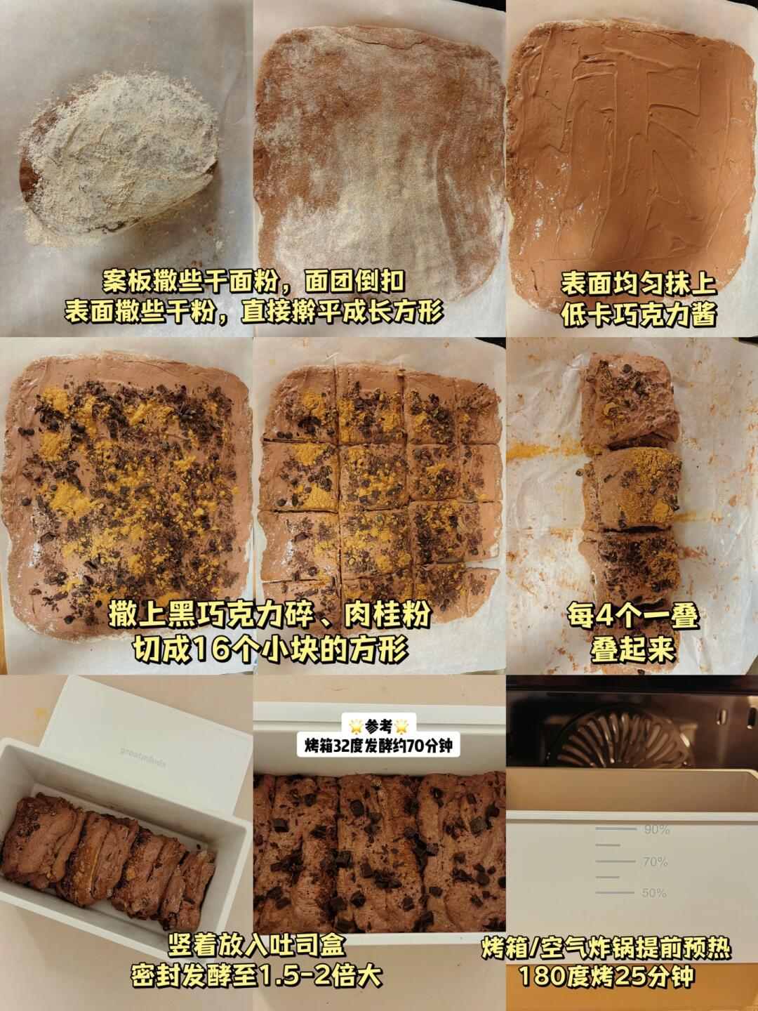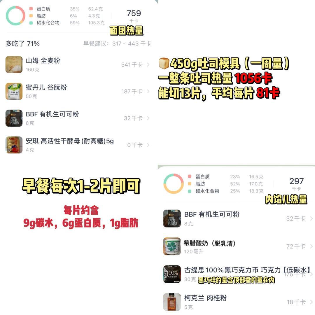 👩‍🍳巧克力脑袋👀过来~超浓郁,可以撕着吃的爆浆巧克力吐司了解下👏无油糖,高蛋白,免揉面,懒人做法超简单,做一次管一周‼️ 💕81卡/片(13片)|烤箱/空气炸锅都🉑 🌈减脂、健身、巧克力控、吐司、碳水脑袋都去做 . 🍃食材(1056卡-450g模👉附热量表): 【面团】 全麦粉160g(🉑换中、高筋粉) 谷朊粉50g 可可粉8g 酵母4g 【内馅】 可可粉8g 奶酪(脱乳清)120g 100%黑巧克力碎适量 肉桂粉5g(🉑不放) 🌈海盐、代糖的量自己✋~喜欢肉桂的加点,很上头;顶部撒巧克力碎或者奥利奥碎都很ok . 📖简单步骤一看就会,直接翻图6️⃣、7️⃣ 🌈面团水量很大,可以冷藏过夜~ . 食材简单,美味不简单‼️ 做早餐,切片抹奶酪/花生酱,配杯咖啡、牛奶,真的很nice‼️ 🌈纯黑巧入口有些微苦,但很上头,也不用担心一次吃多‼️模具是greatminds450g吐司模,高颜值,不沾模,一长条能切13片~