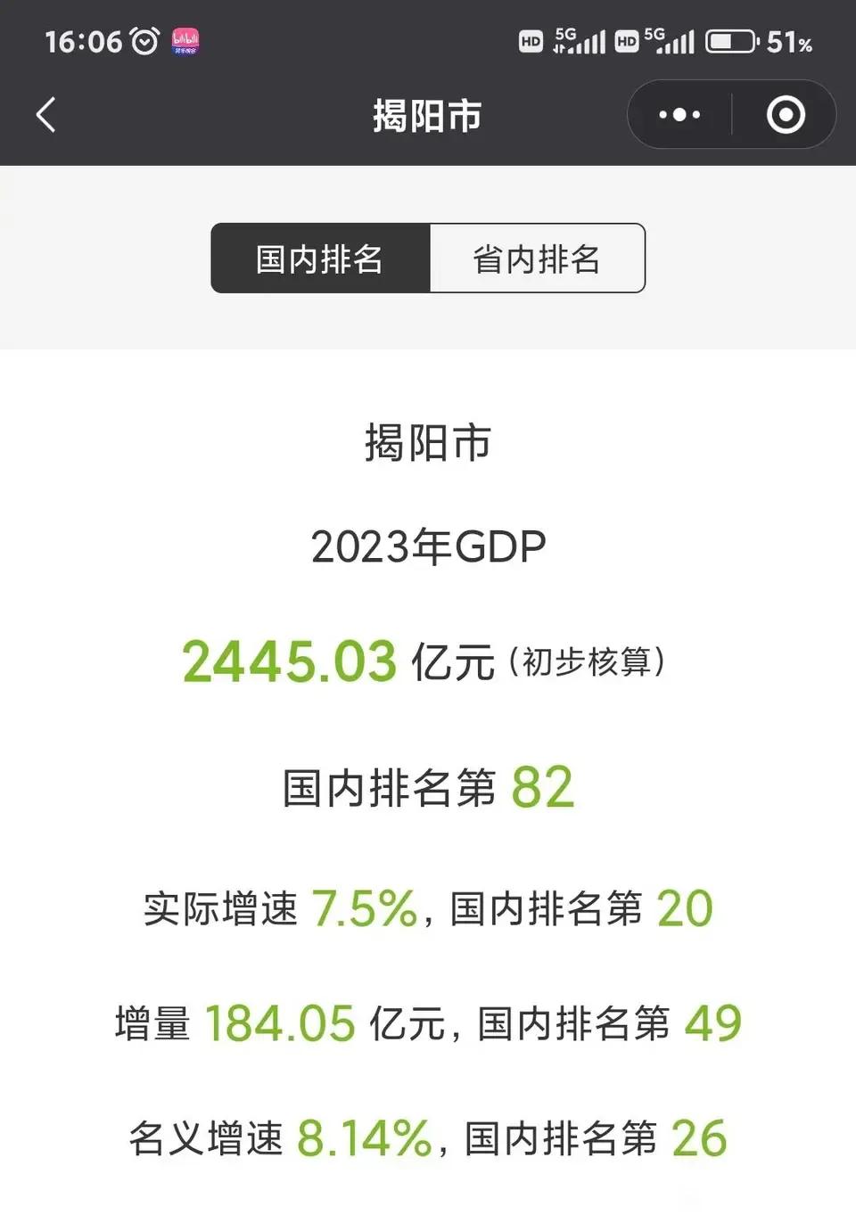 揭阳2023年GDP2445.03亿!实际增速7.5%,增量184.05亿,名义增速8.14%。揭阳太优秀了,增速远超全国全省平均增速!近年揭阳的快递和电商异军突起,在全国排名直线上升,相应也带动了GDP的快速发展。潮汕三市,揭阳名气最小,条件最差,但发展的最好,太励志了!