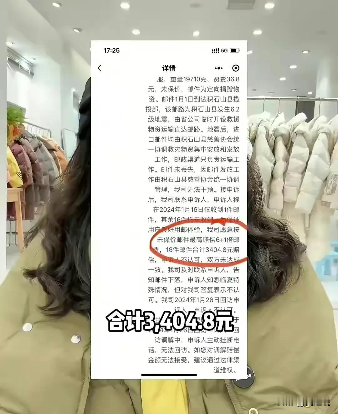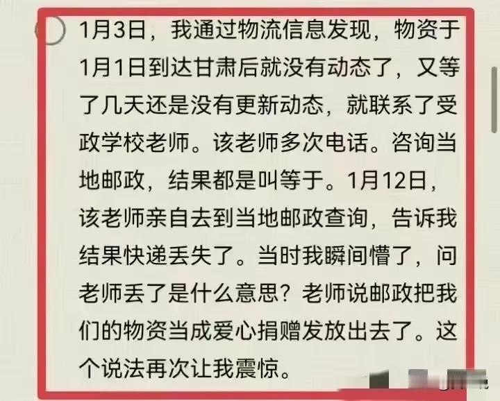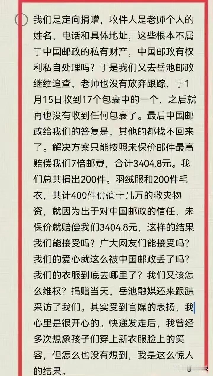 太坑人了!女子捐的十万元衣物被邮政弄丢,赔偿只够买双鞋? 最近有个好心的女子给甘肃灾区的学校捐了价值十万元的衣物,结果你猜怎么着?被邮政给弄丢了!你说气不气人? 这女子是个服装店的老板,看天气冷了,就想着给灾区的孩子们送点温暖。她特地选了400件羽绒服和毛衣,想着让孩子们过个暖和的冬天。可是呢,左等右等,就是不见包裹到学校。 一问邮政,才知道包裹早就不知道哪去了。 这女子当然不干了,找邮政要说法。你猜邮政怎么说?人家说按规矩来,最多赔你7倍运费。啥? 十万元的东西你就赔这么点?这点钱连双鞋都买不到吧! 这事儿一传到网上,网友们都炸了锅了。大家纷纷表示,这邮政也太不靠谱了,这么点赔偿简直就是在欺负人。还有的网友说,以后都不敢捐东西了,怕被坑。 现在这事儿闹得这么大,邮政也坐不住了,说会好好处理。但愿他们能给个满意的答复吧,不然这爱心捐赠的路可就真难走了。 #我来唠家常#