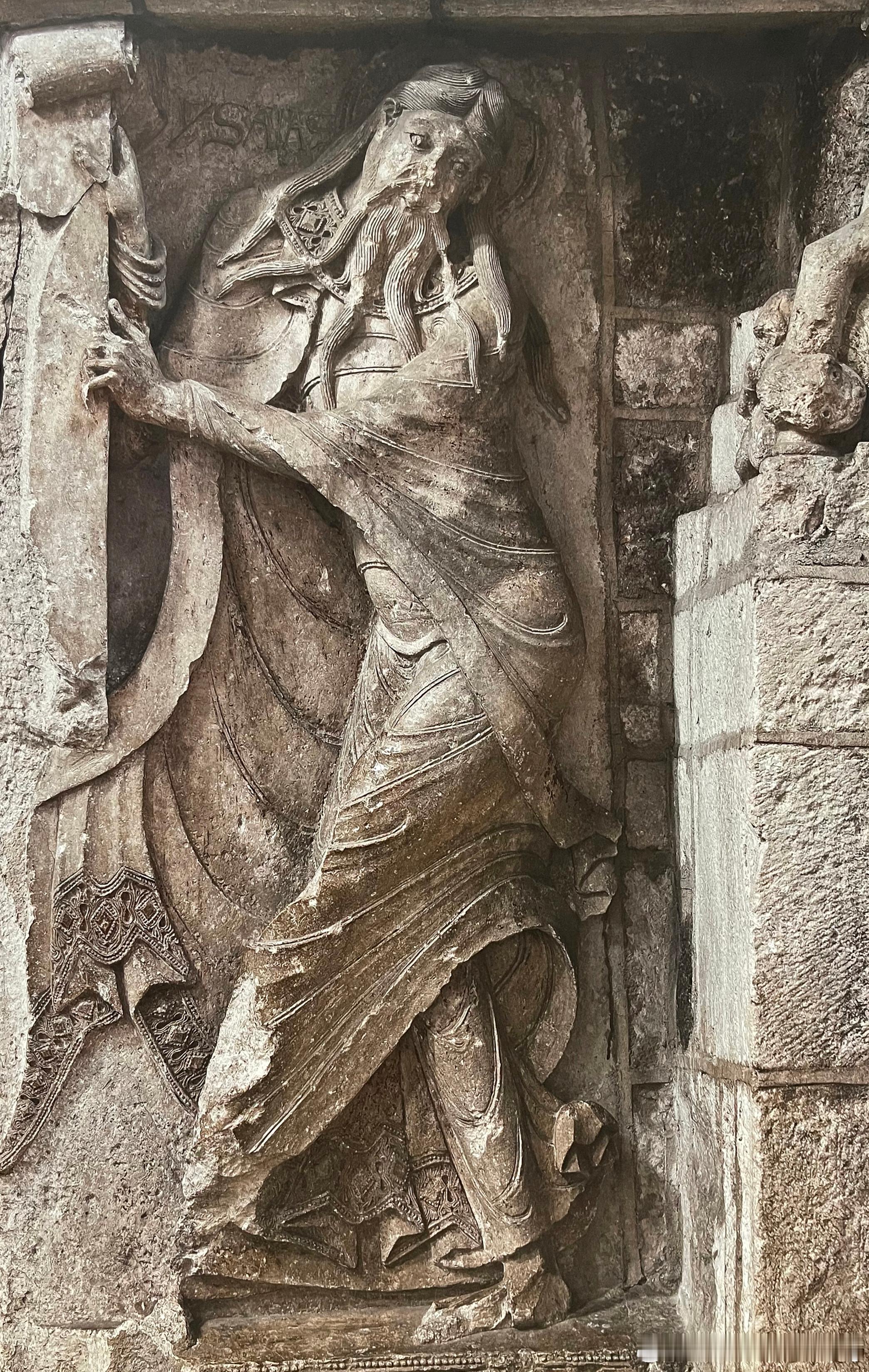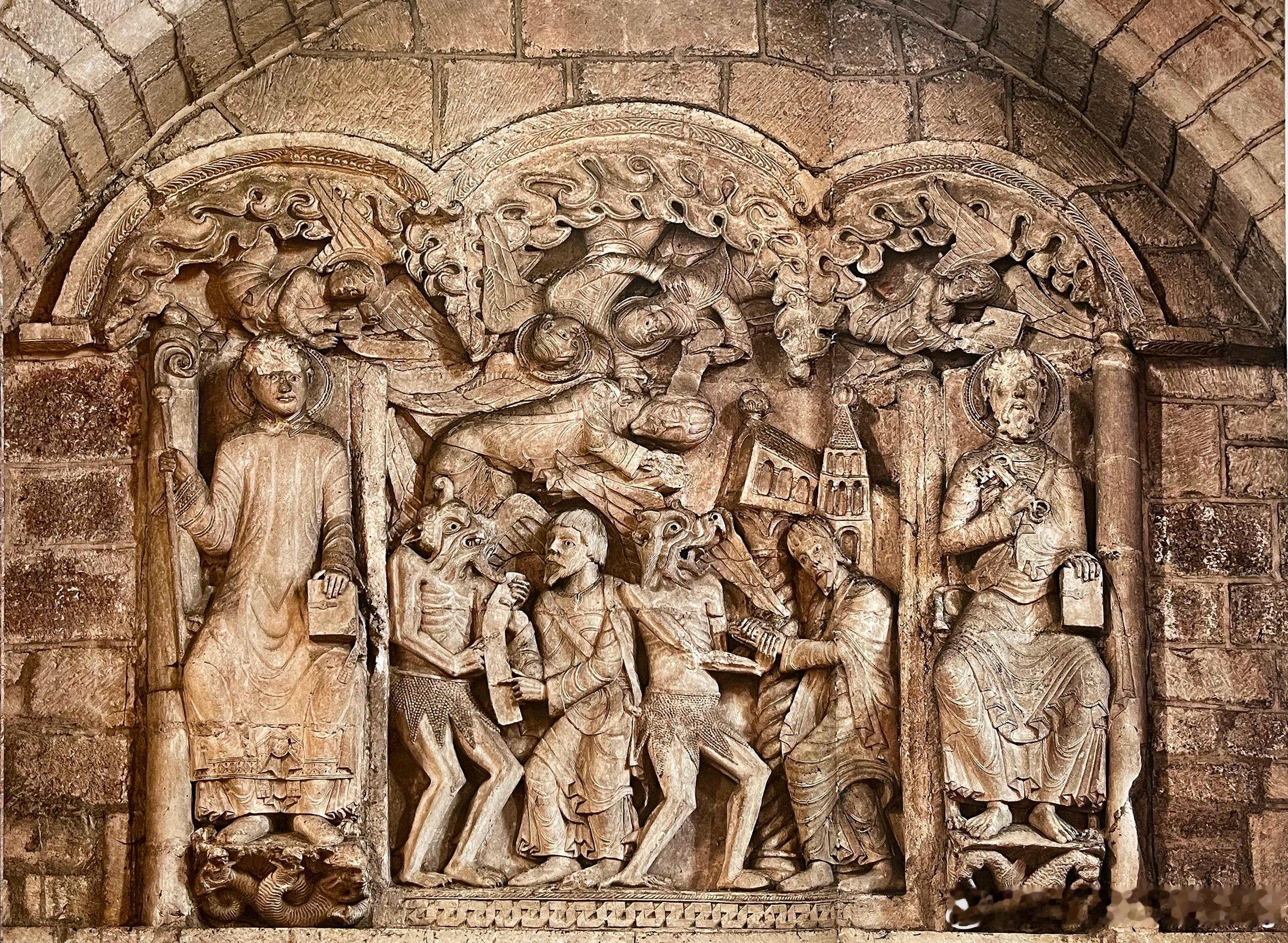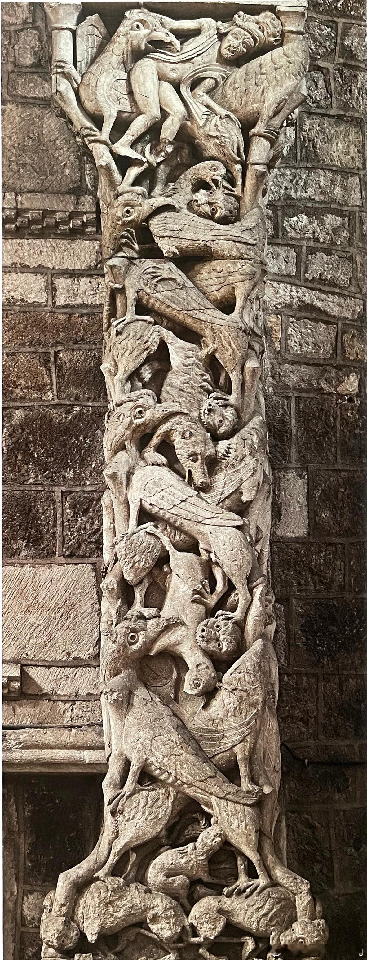 已损毁正门的门中柱充分展现了其惊人的雕塑表现力。左侧刻画天使从天而降,阻止以撒的牺牲;外侧表现吞噬人并被其撕咬的野兽,对称的构图削弱了若干凶残气息,混沌与秩序分庭抗礼,相持不下--这是罗马式艺术中的常见原则。