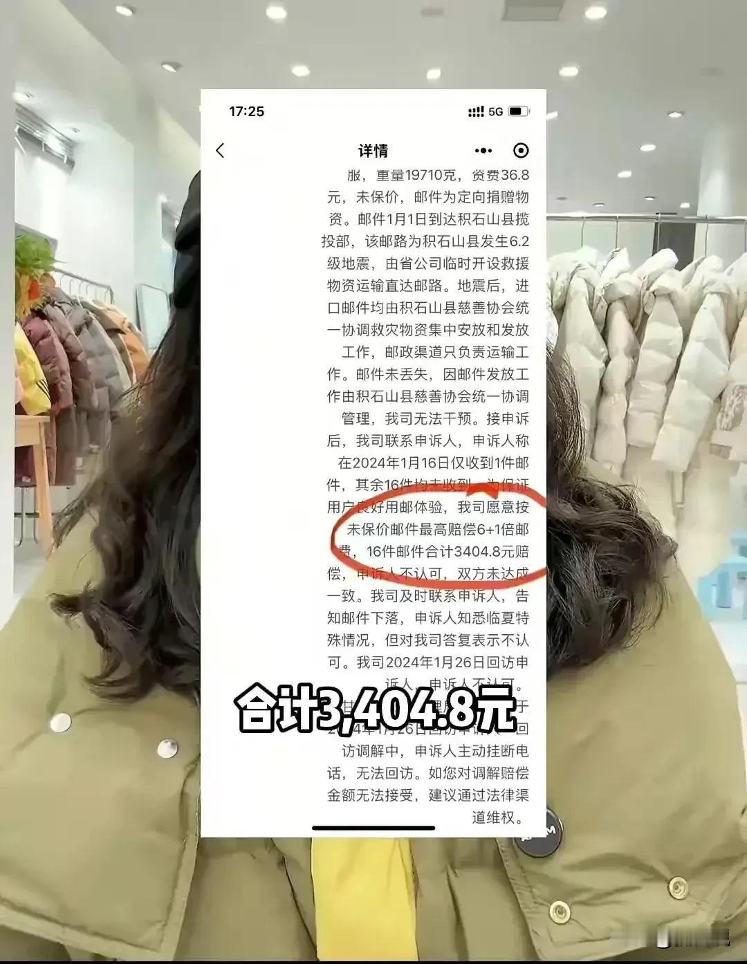 女子捐灾区400件羽绒服和400件毛衣,价值十多万元的物资,被邮政弄丢后,历经一
