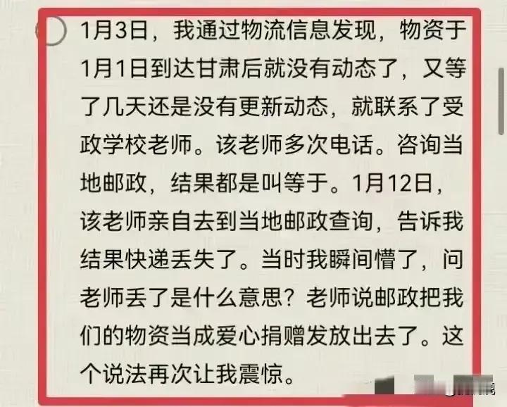 捐赠的物资应该是被标记了,到了甘肃就被私下拿去卖了,没看这次是甘肃邮政私下解决了么,估计是赔钱了事。