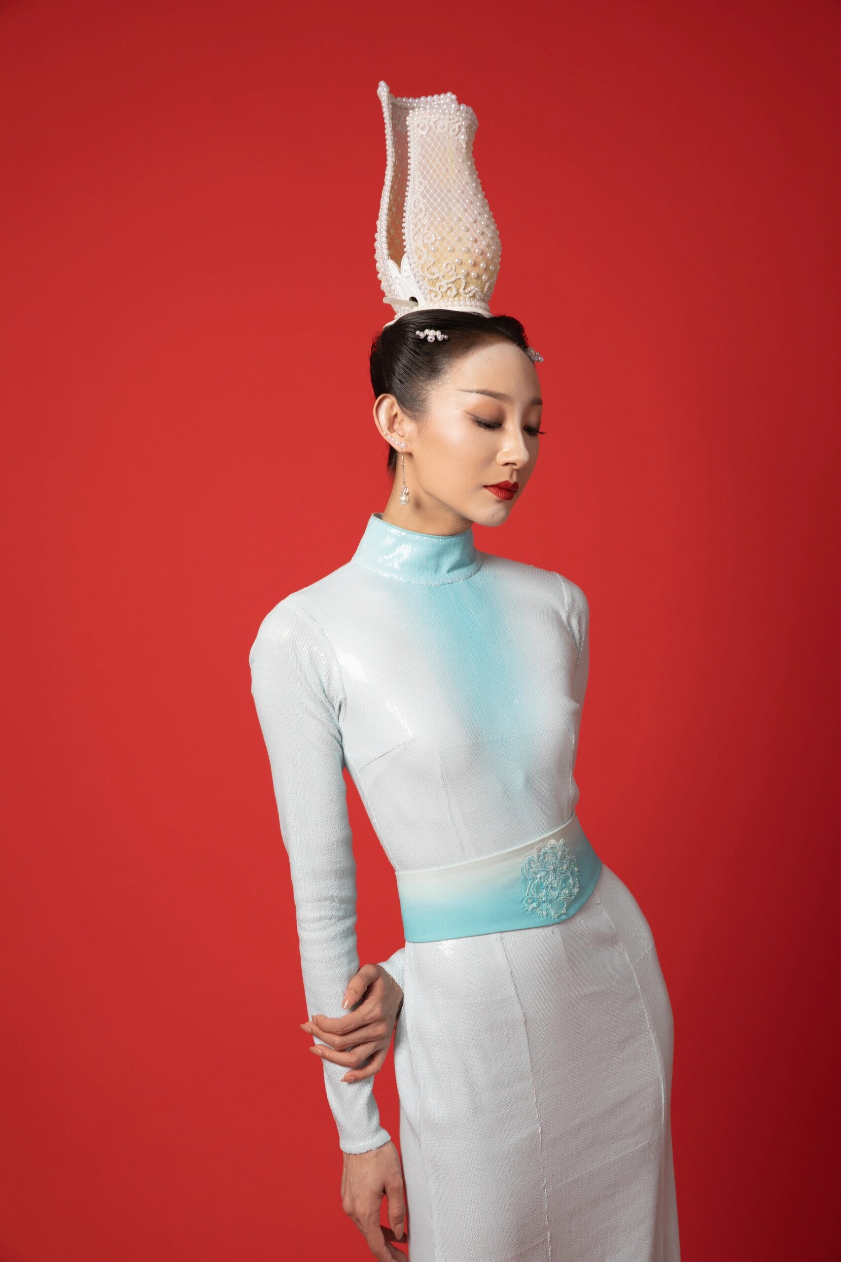 宋人在生活中崇尚极简服饰格调,其女子冠式搭配在总体上呈现端雅清淡的韵味。清新自然的宋制冠式种类繁多,宋王得臣在《麈史》中就记载了丰富的款式,如“山口冠”、“云月冠”等等。此次造型设计灵感来源于宋代“山口冠”,结合宋代景德镇瓷器特点加以设计改良为“瓶冠”,“瓶冠”取谐音“出入平安”之意,寓意着国泰民安的祖国繁荣昌盛、吉祥美好,以舞跃太平盛世。冠式设计独特,前后两侧高耸,中间凹下如瓶口,造型独特,灵动秀逸。妆面整体以宋代“三白妆”为灵感,在额头、下巴和鼻梁这三处着重涂白,以凸显面部的立体感,雅致而不失精致,恬静文雅。头戴平安冠(瓶冠),月下露三白,窑火千年,匠心永续。