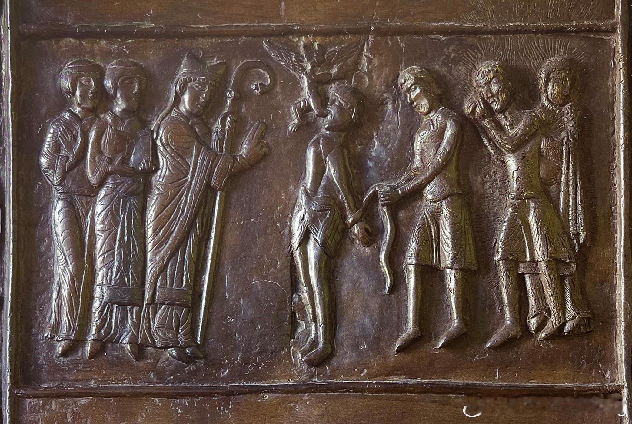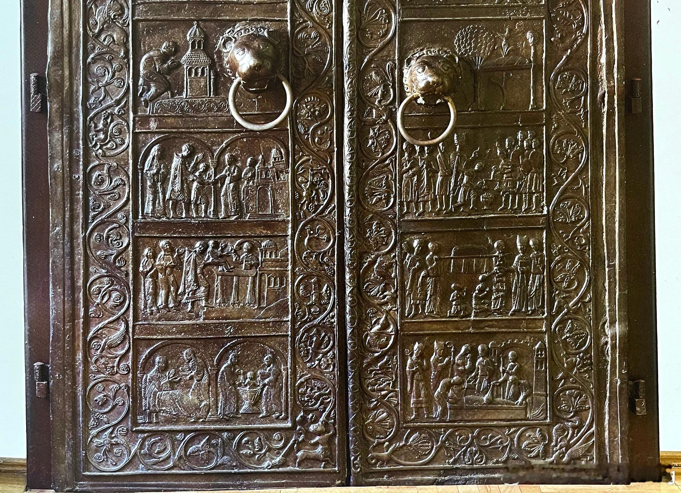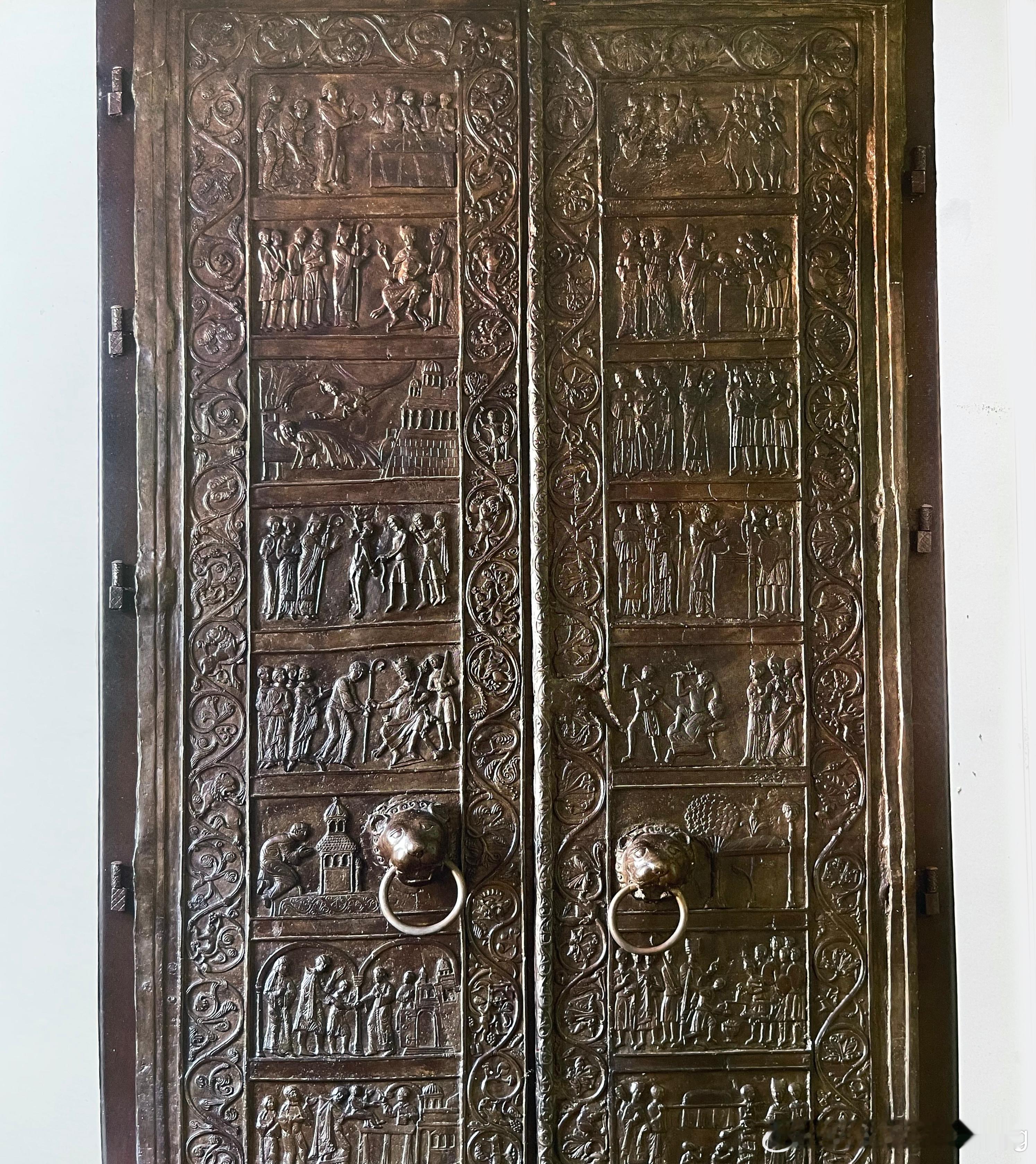 格涅兹诺主教座堂南正门的青铜门板,是用来纪念波兰的守护圣者圣阿德尔波特。图像叙事从左门底端向上发展,反向描绘圣者生平的18个场景,编排深具特色,也是重要的历史遗迹。两扇规格一致的铜门浅浮雕图像外各围着一圈茛苕叶宽饰带。左门外框留有三位大师的签名痕迹。其正确全名已无法辨识,但从艺术史脉络刻推知他们来自马斯河地区,当时必定是在现场直接完成铸模。