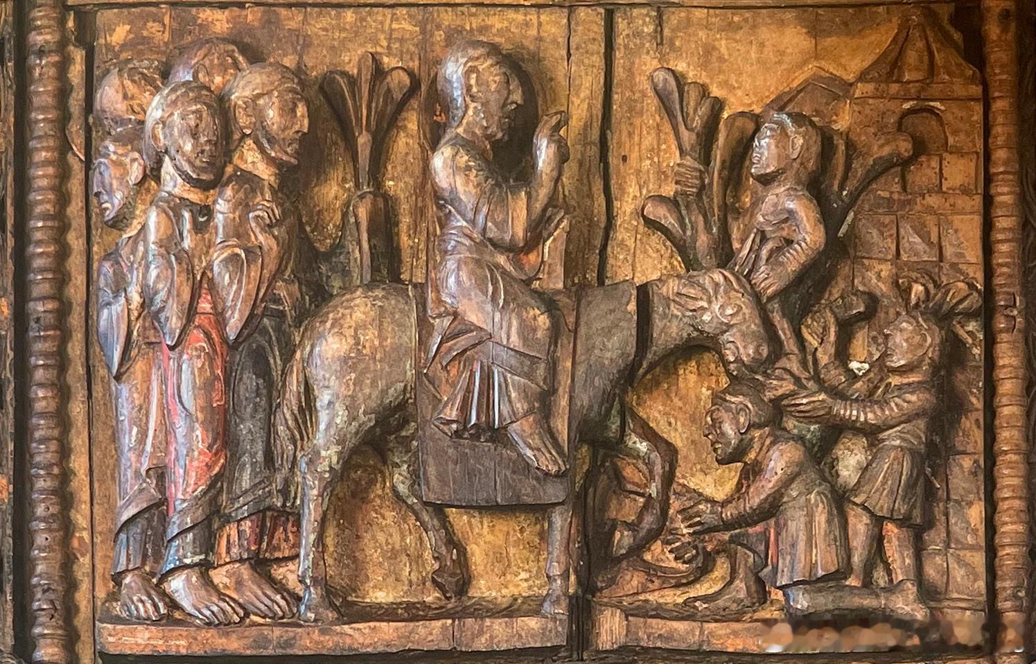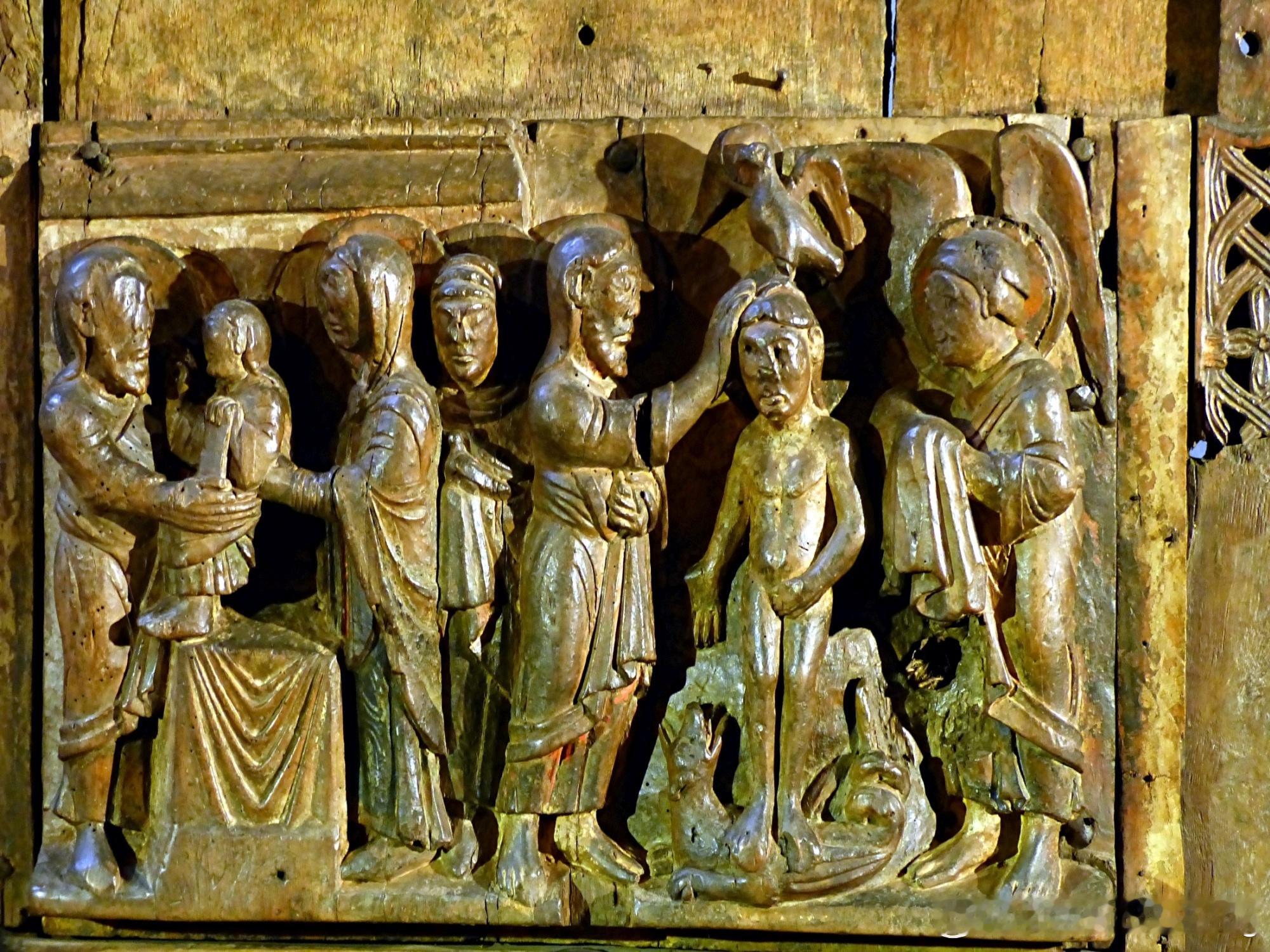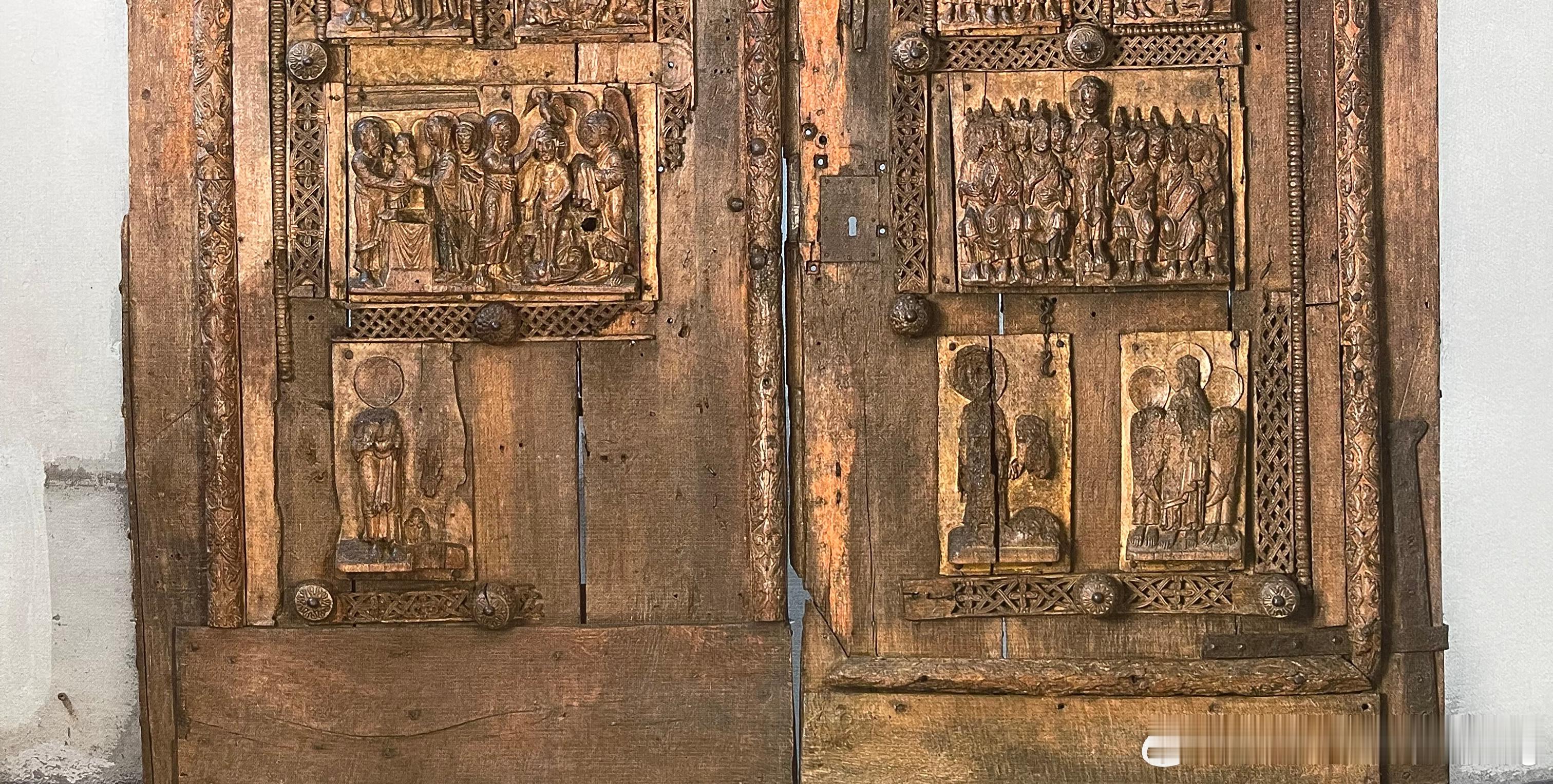 德国现存的唯一一座罗马式雕刻图像的木质大门,来自位于科隆的早期本笃会圣玛丽女修道院,它高472厘米,被视为科隆11世纪的雕刻杰作。两扇门板各以近方形画面描绘八组人像,中间各穿插三幅横式或风景画式的图像,最后是底下的四幅肖像,其中一幅肖像已佚失。每个胡桃木方形图画都裱在橡木板上,左侧画面描绘基督的童年场景,右侧描绘基督作为牧者及基督受难。以深浮雕表现的人物及其服饰生动自然,细节丰富。经年轮学分析,其完成年份在1050年左右。