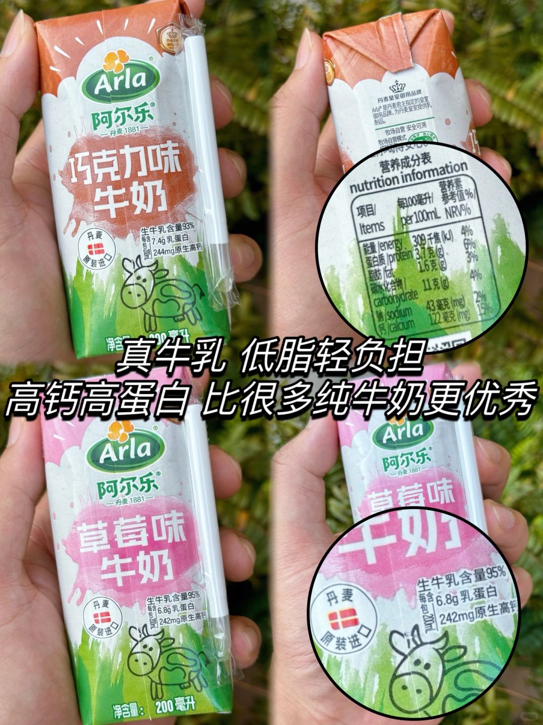 两款口味的风味奶,生牛乳比同产品高多了,草莓的含6.8g优质乳蛋白,242mg原生高钙,巧克力的含7.4g优质乳蛋白,244mg原生高钙,营养成分比很多其他的纯牛奶更优越!我一口气连喝两盒,早八奶娃子放心冲!