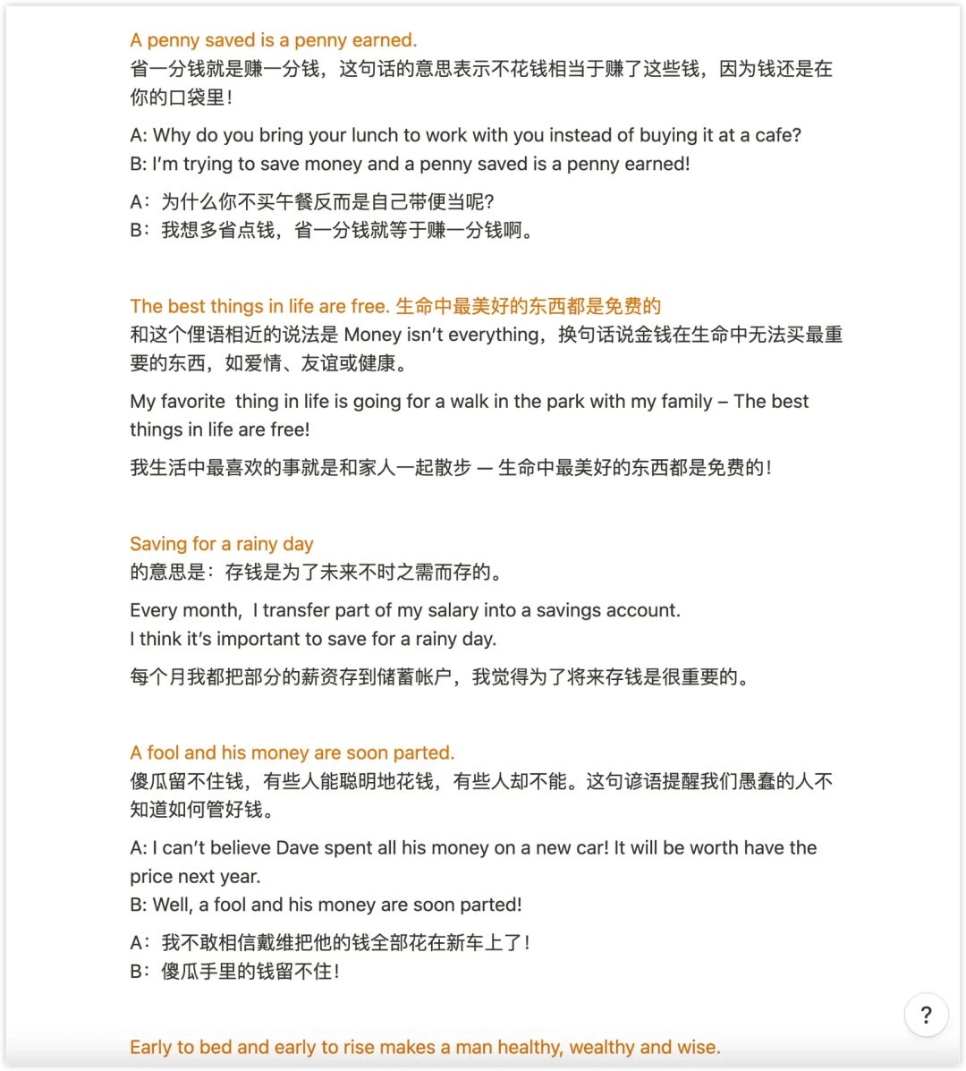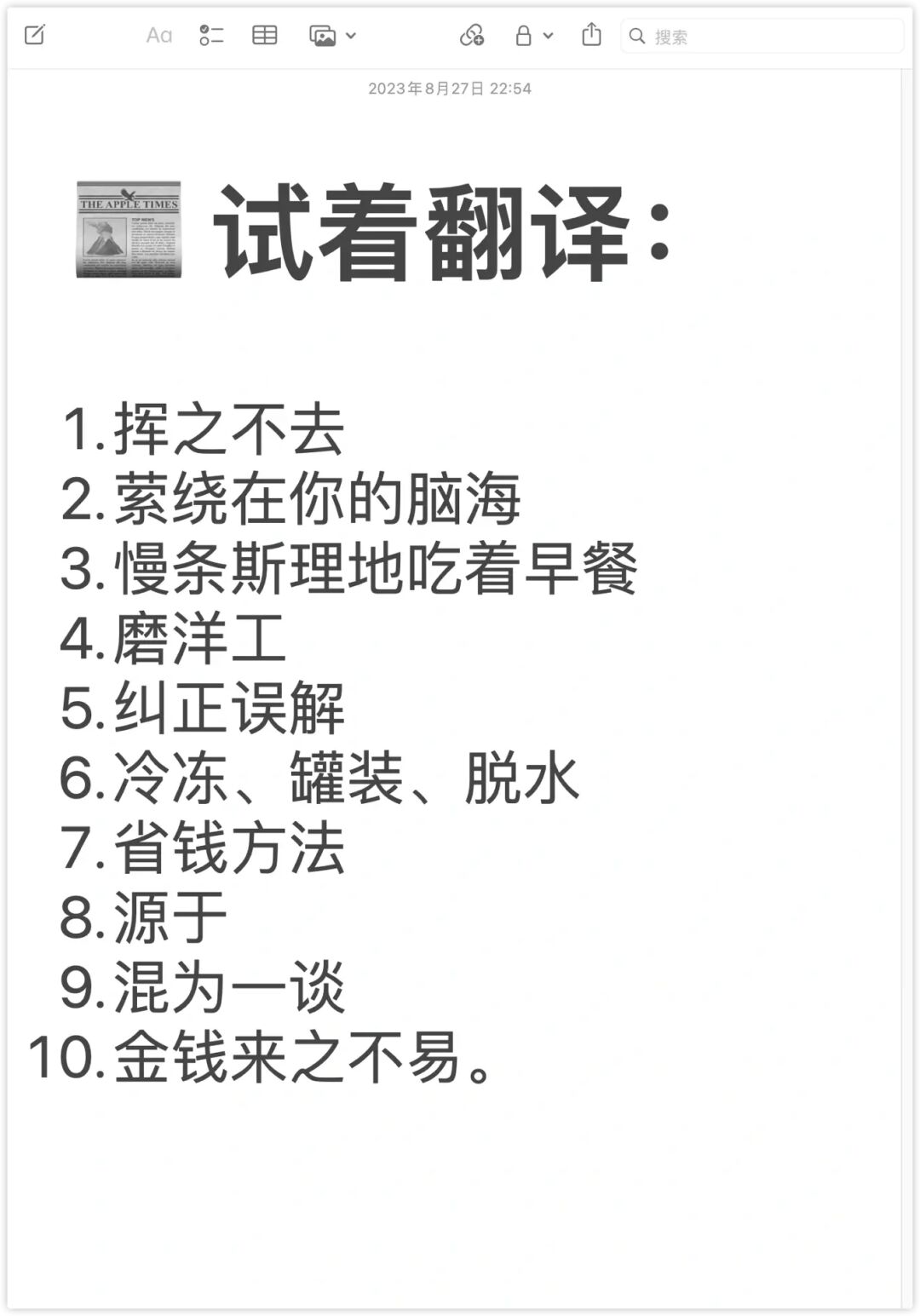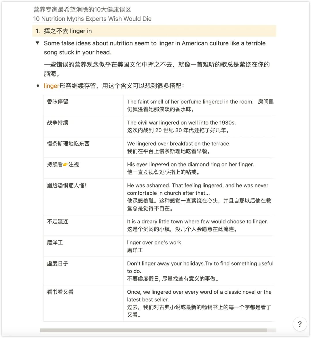 [红薯R] 1. 挥之不去 linger in 2. 萦绕在你的脑海 stuck in your head 3. 慢条斯理地吃着早餐 linger over breakfast 4. 磨洋工 linger over one‘s work 5. 纠正误解 put/set the record straight 6. 冷冻、罐装、脱水 frozen, canned and dried 7. 省钱方法 money saver 8. 源于 stem from 9. 混为一谈 lump together;conflate 10. 金钱来之不易。 Money doesn’t grow on trees. [红薯R] 外刊专题:纽约时报 写作 1-5 完整版 6页PDF [烟花R] flag:为什么明明知道看了评论会不开心,还看?