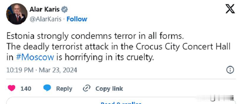 爱沙尼亚要求俄罗斯自我检讨遭恐怖袭击 ——莫斯科遭灭绝人性的恐怖袭击,引发全世界的声讨。但俄罗斯宿敌爱沙尼亚却声明谴责俄罗斯自我检讨不够。 爱沙尼亚总统阿拉尔·卡里斯称:“俄罗斯指控莫斯科恐怖袭击事件,与乌克兰及其西方盟友有关联,是一种仇恨心理,应首先自我检讨”。 爱沙尼亚外交部长马古斯·查克纳发文称:“音乐厅遇袭事件清楚地表明,普京政权没有能力确保本国人民的安全和福祉,乌克兰及其西方盟友没有责任”。 这口气简直是政府恐怖主义嘴脸,完全符合县、镇级小国水平! (译文整理)