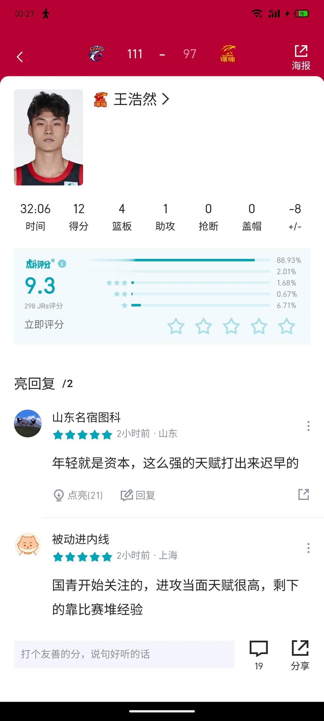 深圳男篮的王浩然最近出场时间比较多,发挥得也挺不错的,是个潜力球员的样子。 去年青年世界杯期间,非留洋组的球员,他是最让人期待的之一,敢打敢拼,希望之后能打出来。 #中国男篮# #中国篮球# #CBA联赛# #深圳男篮#