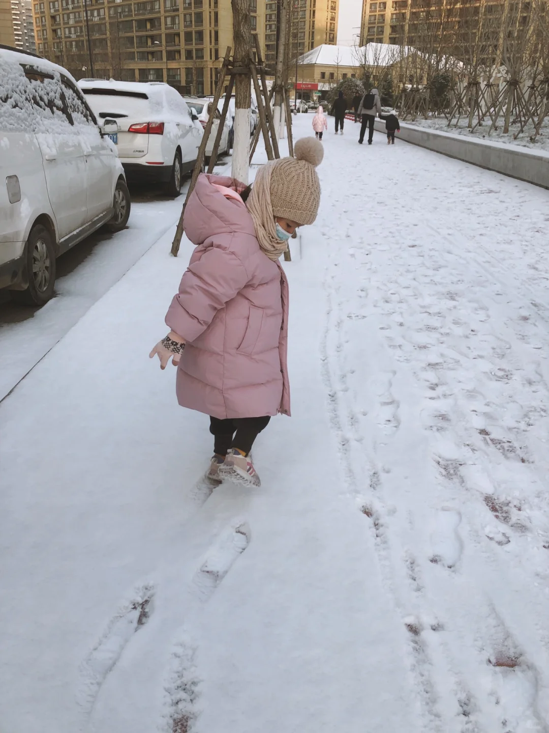 青岛也终于下“大雪”了。多少年都没有这么大的雪了,一觉醒来,远方山上、树枝上、马路上全部被雪覆盖。 玏玏人儿上学路上也很高兴,一路走一路听着踩雪嘎吱嘎吱的声音,高兴极了~ 雪是天空的礼物,是圣诞老人的足迹。 雪花像银色的蝴蝶般纷飞,给大地披上了一层厚厚的白色羽毛。