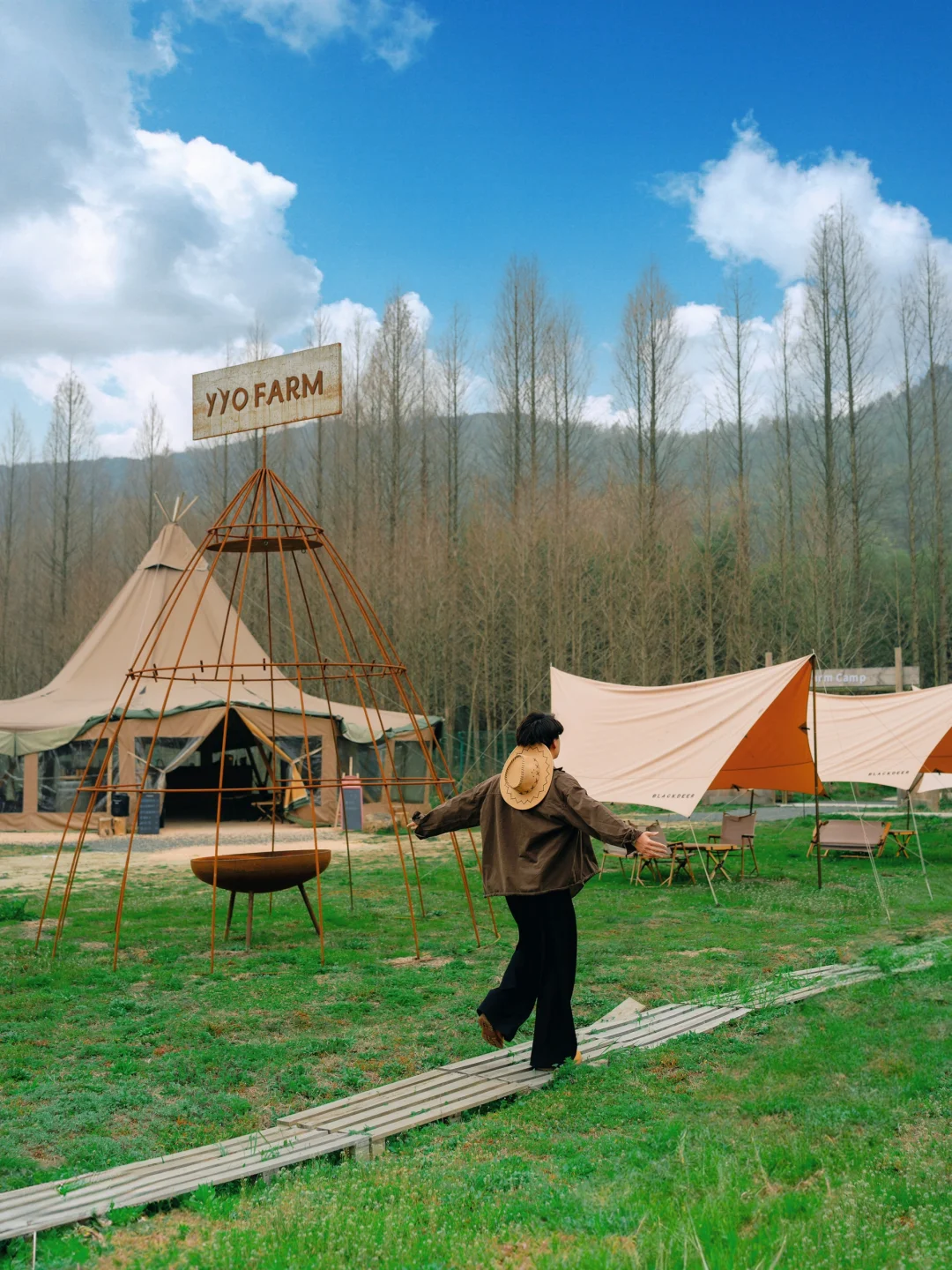 草坪上有天幕帐篷和秋千,围炉煮茶还是拍照打卡都合适