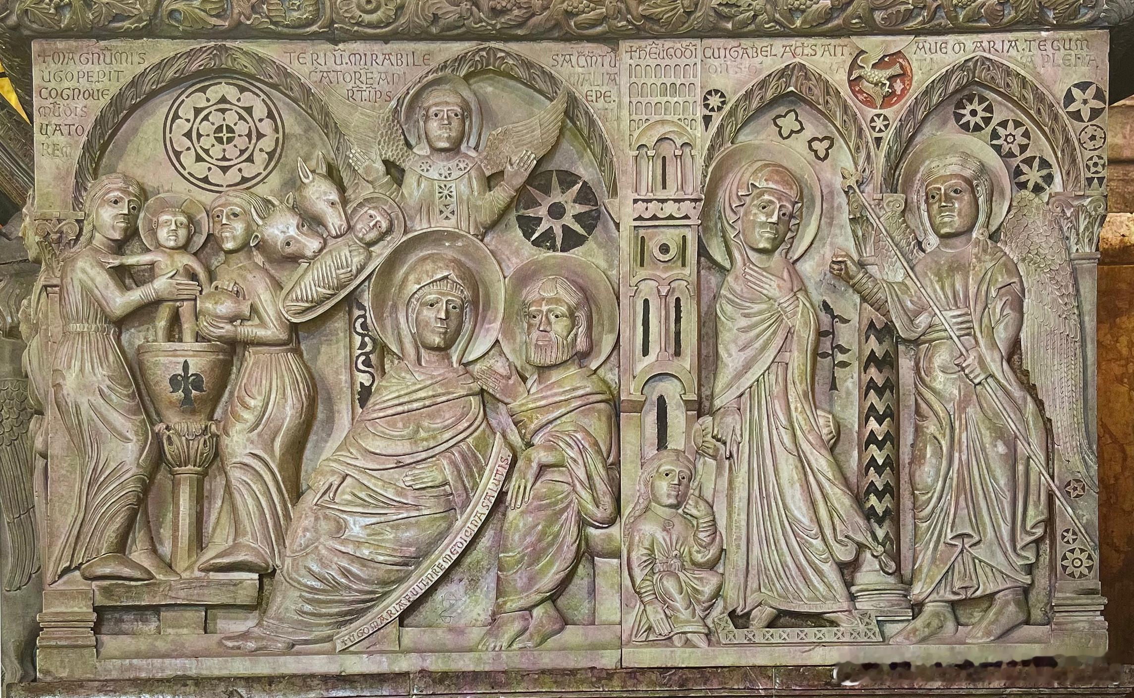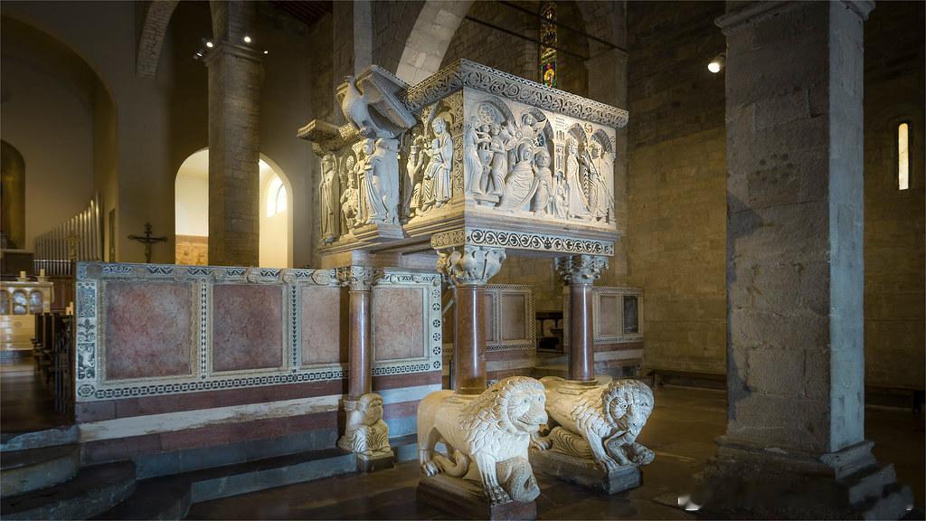 在相对规模不大的巴尔加圣克里斯多福主教座堂中,罗马式布道坛以原有的唱诗班围屏形式保存至今。长方形布道坛基座底下有四条红色大理石柱,其中两条前柱支以狮像。一根后柱前方有一个融入底座但未发挥支撑功能的男性蹲像;另一根后柱底下有台座。布道坛四面围着尖拱构成的盲拱廊。浮雕场景从左至右展开。首先是南面的先知以赛亚,接着是西面第一幅的天使报喜,随后是圣婴诞生与圣婴洗浴,北面紧挨着读经台的第一幅是三贤士来朝,其后是福音书作者;三贤士中的一人已上前致意,但读经台左方还有两位贤士未下马。最后一幅是教堂守护者圣克里斯多福像。布道坛外缘的镶嵌与浮雕图案加强了其装饰效果。