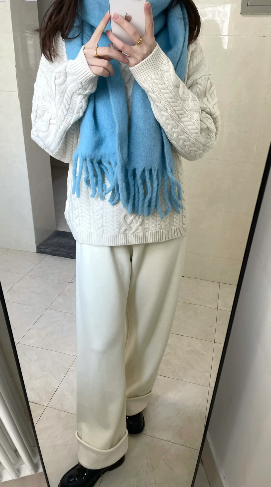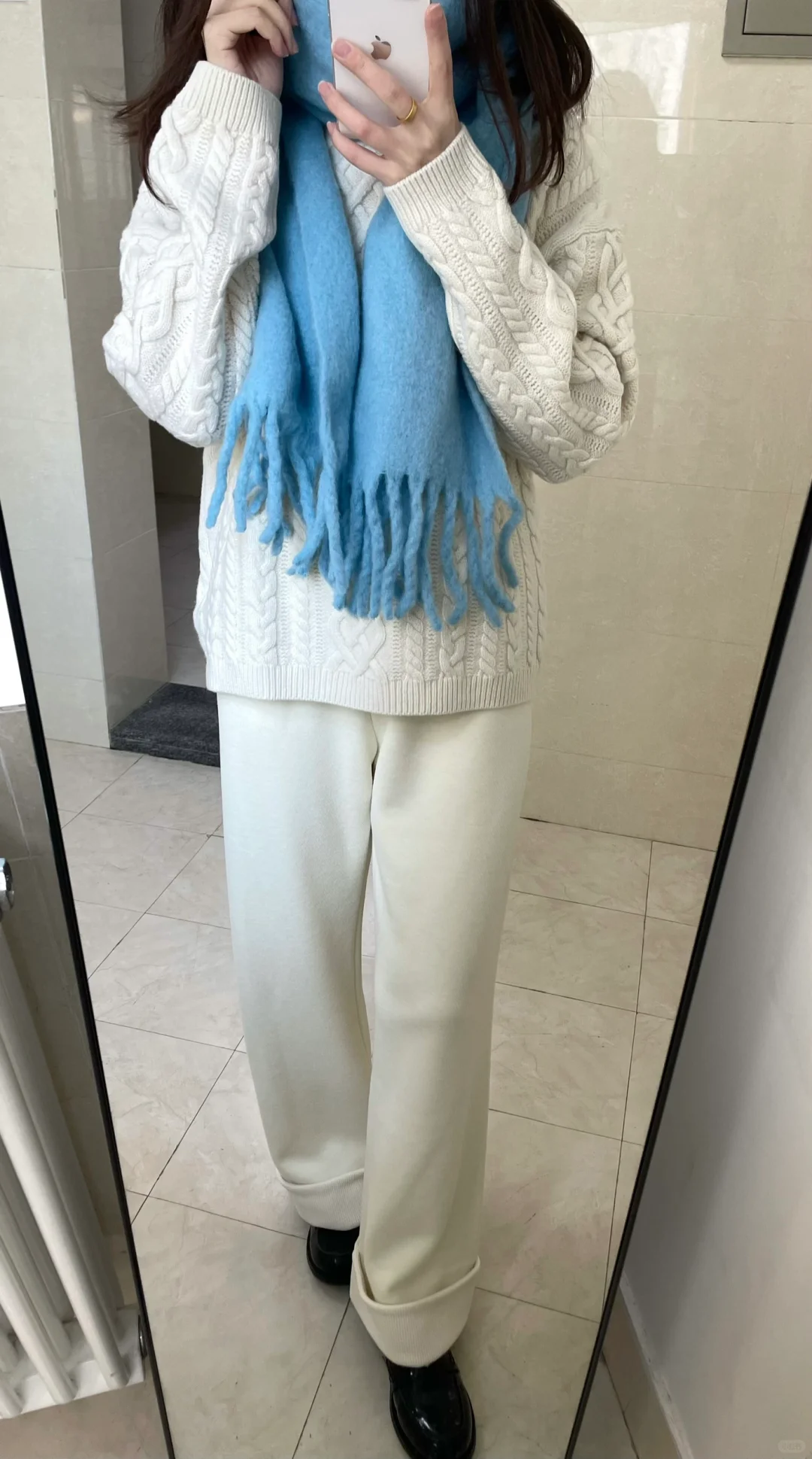 优雅东方韵,浅蓝上衣配米色长裤,漫步古风庭院,尽显时尚与古典的完美融合。