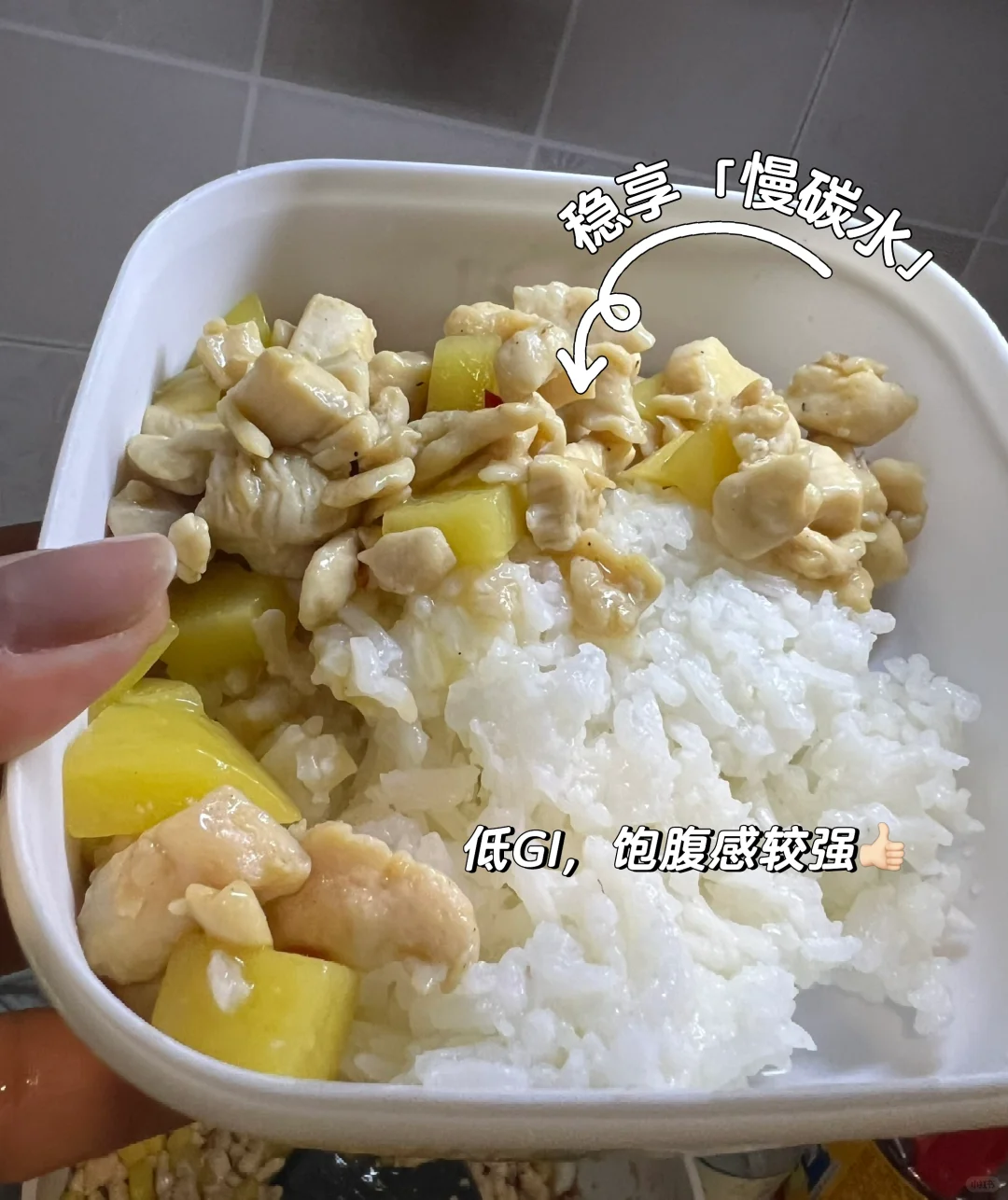 每顿一拳大小熟米饭作为主食,真的满足得不行,盖上土豆鸡肉丁谁吃谁迷糊😋
