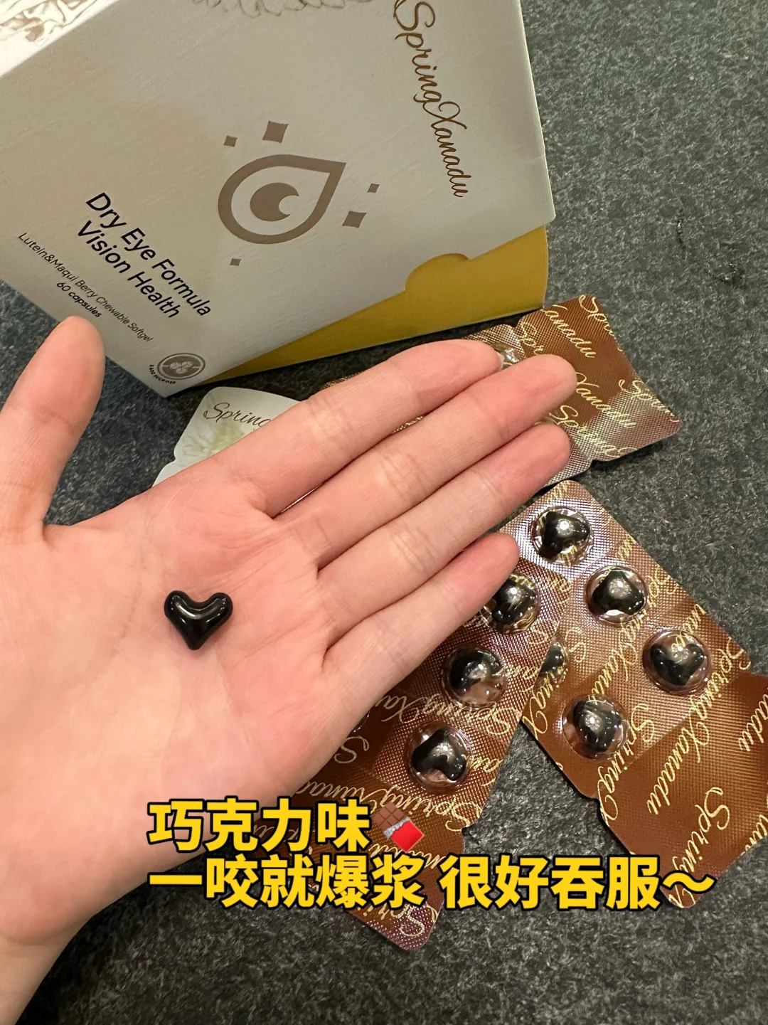 它的剂型也很特别,是巧克力胶囊,还是爱心形状