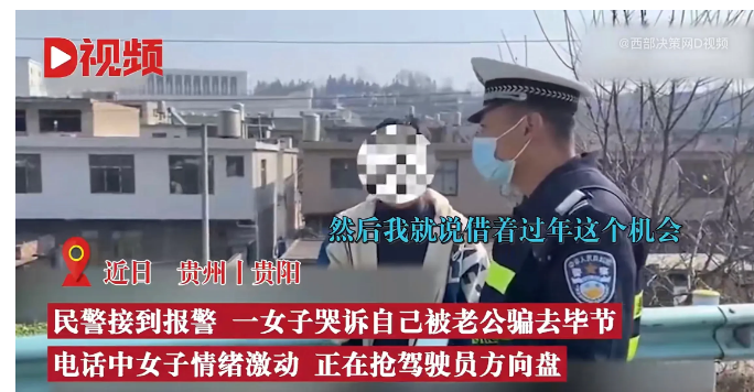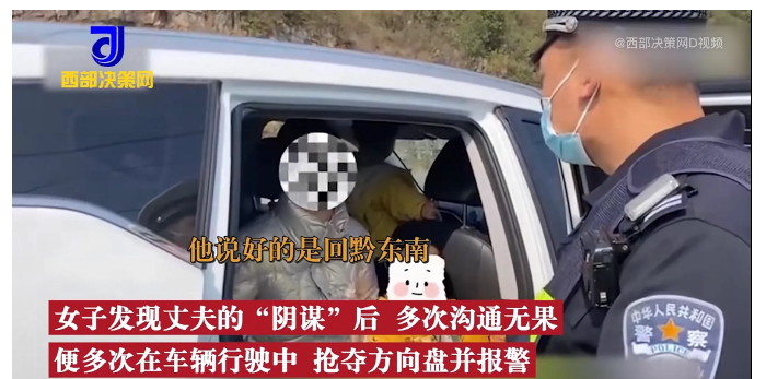 “太吓人了!”贵州贵阳,一男子以回娘家·为由,将妻子骗上车。妻子发现男子是回婆婆家·后,立即与其理论,未果后,妻子竟然在车上有孩子的情况下,去抢丈夫手中的方向盘并报警。最终夫妻俩人哪都不回,先回到出发地点再做打算。