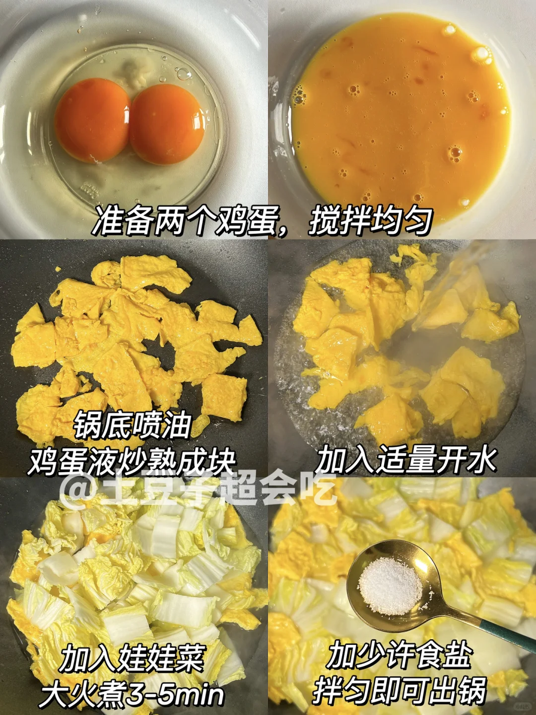 2⃣️ 锅中喷少许油,下入鸡蛋液炒熟成块,加入适量开水,再下入娃娃菜,大火煮3-5min;