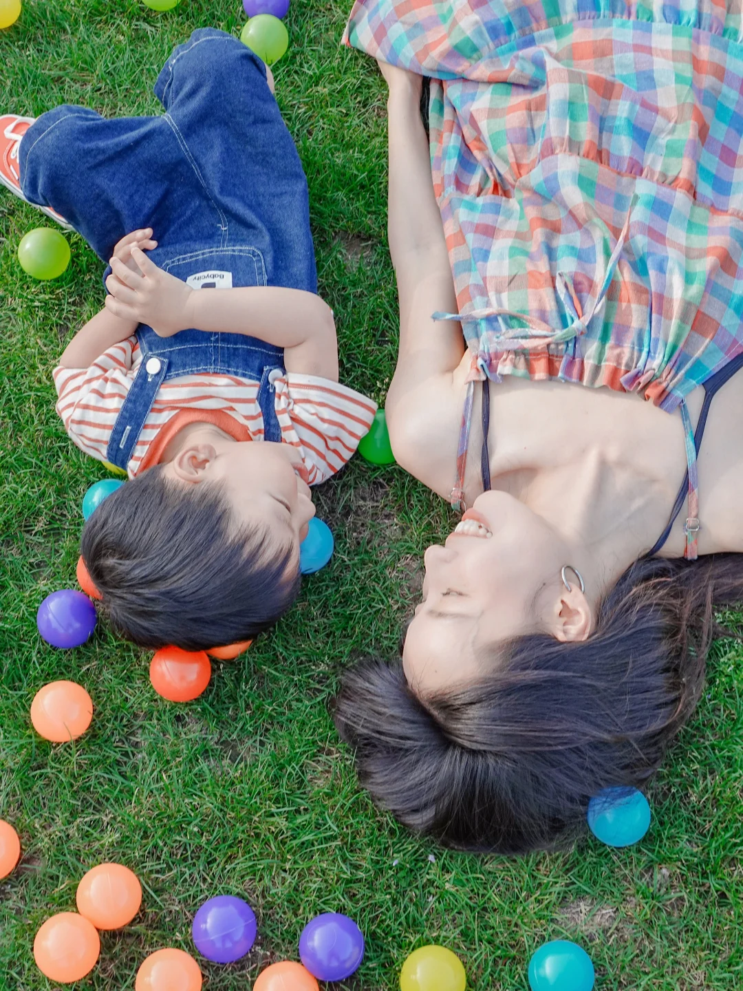 🌟拍远景,把人物放在中间,宝宝和妈妈一起玩海洋球、倒海洋球等的画面