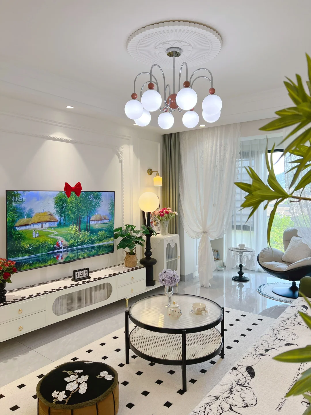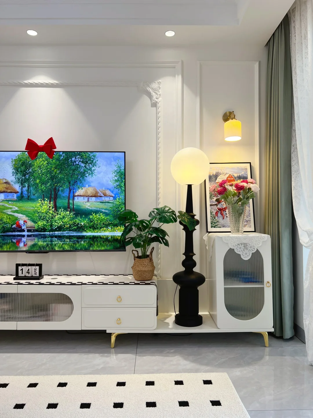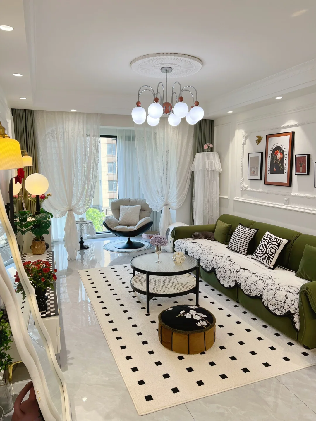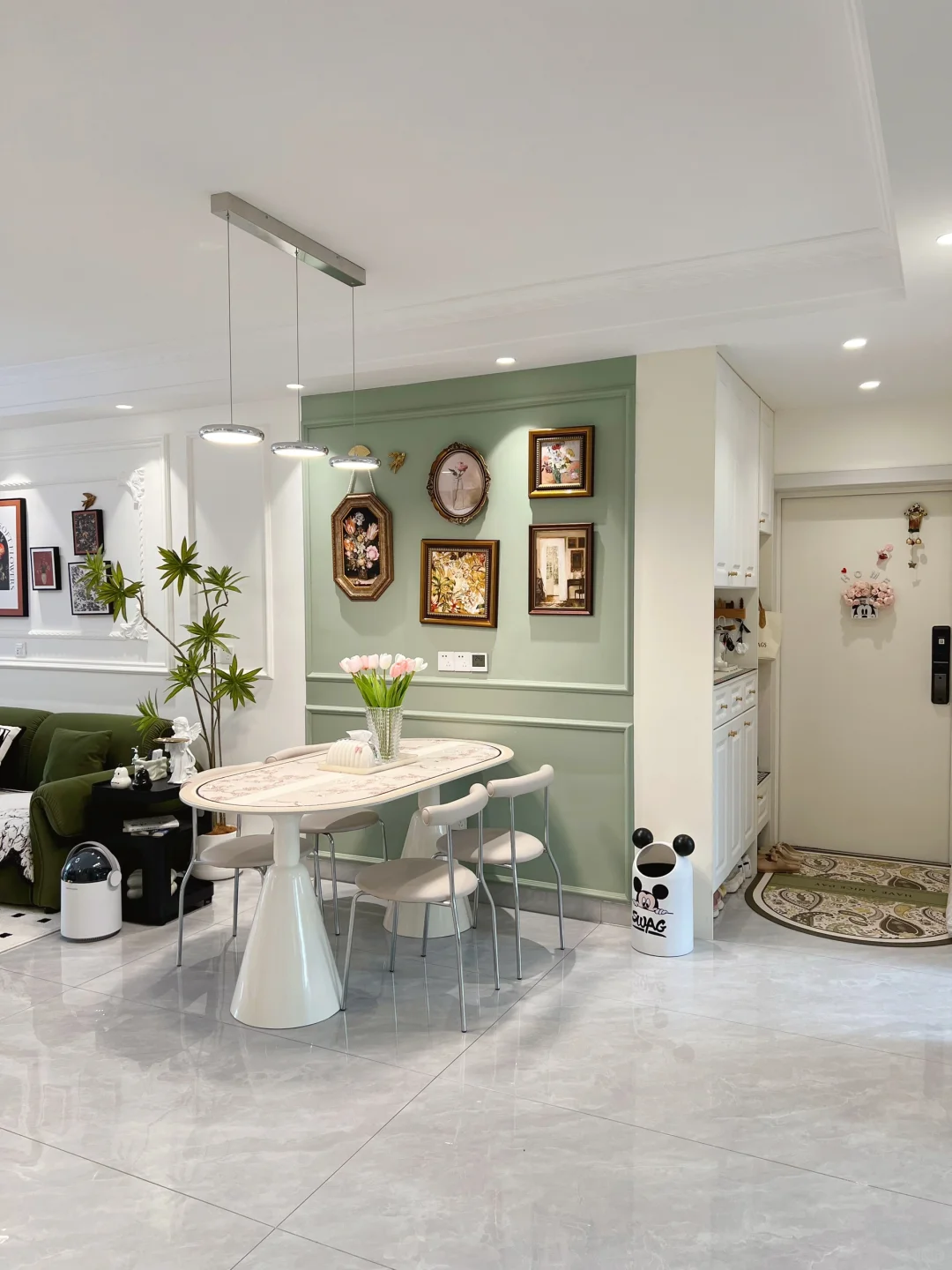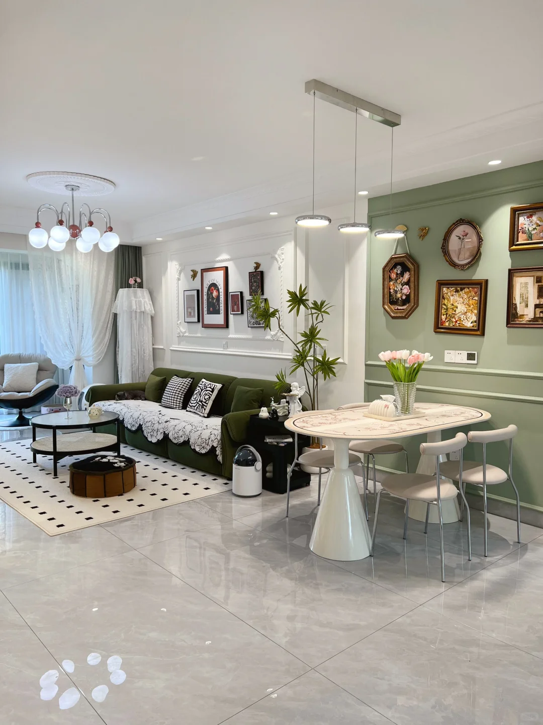 套内只有90平,看起来却像120! 自装的法式风和小户型的适配度太高了 硬装墙面简单的乳胶漆和石膏线 地面直接浅灰色瓷砖通铺,虽然缺点氛围感 但入住发现瓷砖真的很好打理!!! 软装配硬装色系,黑白绿三色为主 层次丰富,充满法式的浪漫氛围感 不喜欢黑白灰的,真的可以试试法式风