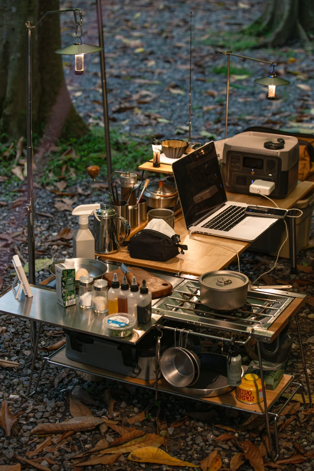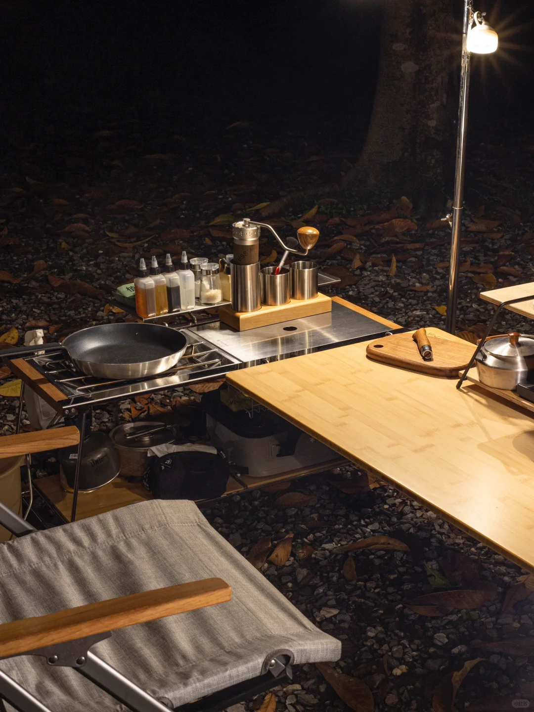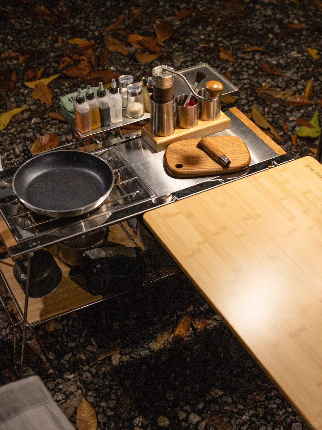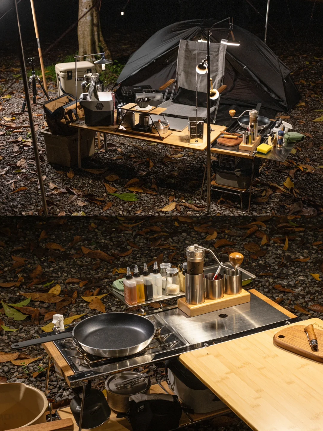 这套转角组合适合1~2人,喜欢露营开火做饭的营友。 露营不做饭,乐趣少一半[笑哭R]可每次开火做饭总是凌乱狼藉的营友们可以参考一下这样的“L”形组合方式,由下方🔗的双层IGT桌担任烹饪桌,三单元或四单元延长板作为主桌,通过双层桌的IGT标准孔位,可以挂托盘,挂架,盒子等配件,放置餐具,调味料,二层可放置锅碗碟,腾空主桌的空间。实测下来,操作很就手,主桌整洁不凌乱。手上有雪峰延长竹板的营友们,可以试试这样的快挂搭配
