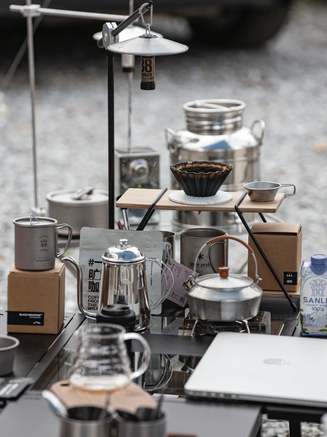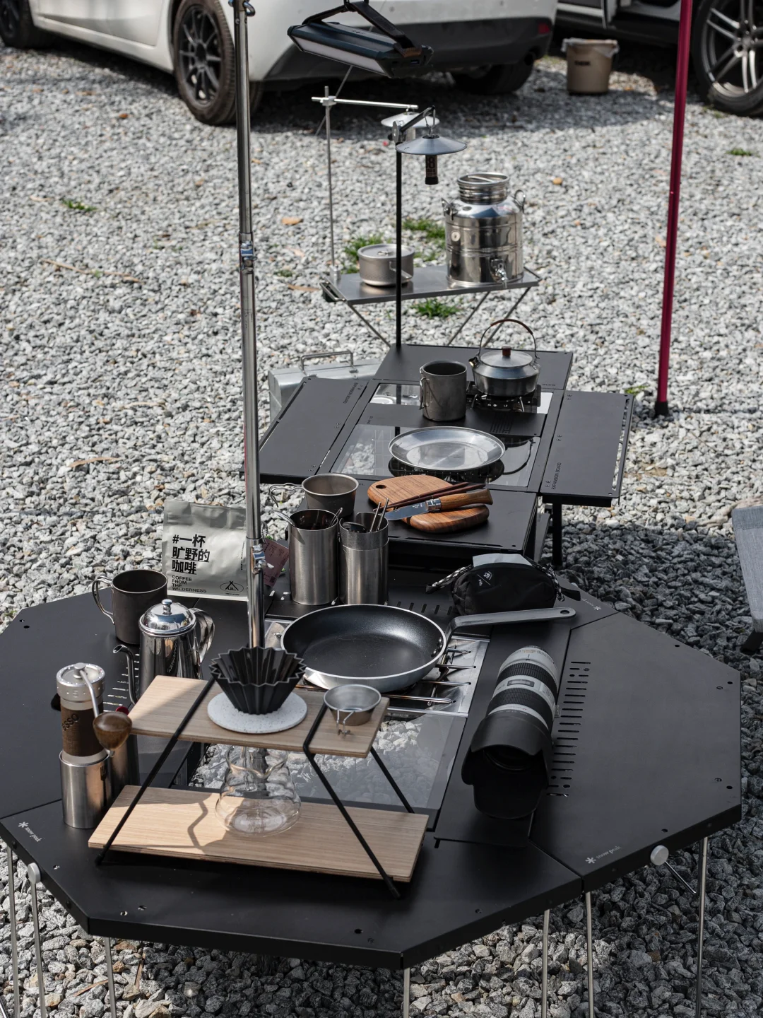 带来一组黑银风格的搭配: 图1图2:jojo工厂的不锈钢焚火小桌,重量1kg➕,承重ok,桌上是理钛的小锅 图3~图5:fishbox小鱼桌搭配雪峰围桌ST-050 图6:雪峰不锈钢灯杆LT-004搭配claymore neo三面灯 图7:fishbox小鱼八角螺母灯杆搭配shuworks铝合金灯罩 图8:朋友的哈苏,啥型号不太懂[笑哭R] 图9~图10:minimalworks小架子 还有没提到的小物可以评论区留言哦
