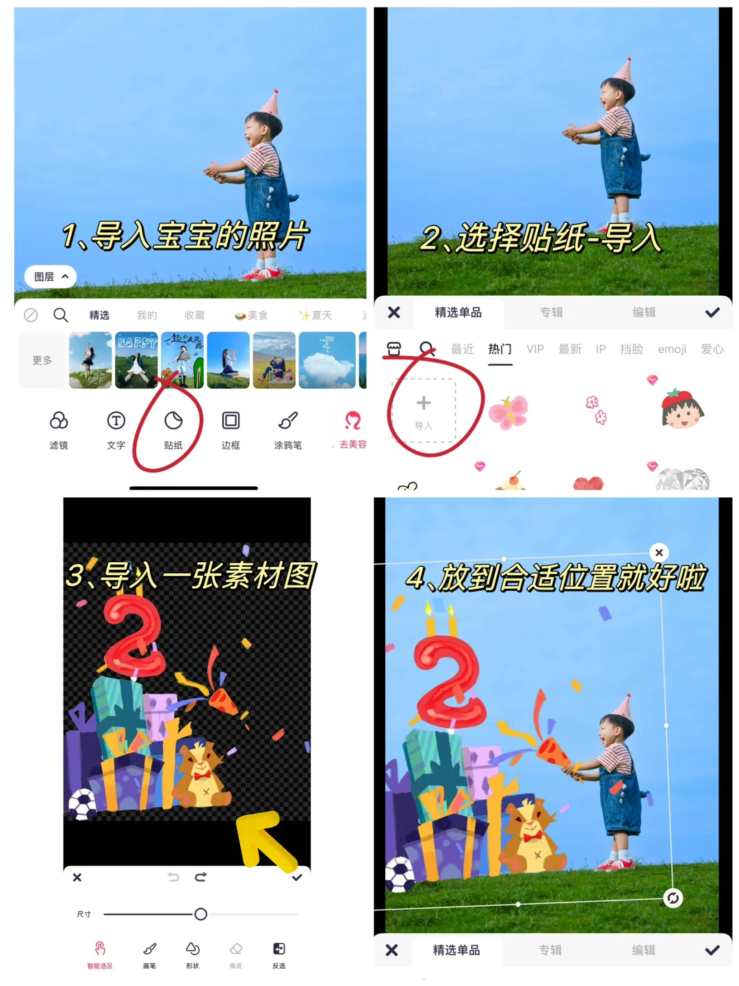 1️⃣导入宝宝的照片,选择贴纸-自定义