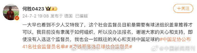 7月2日,何胜发文回应落选:这个社会监督员目前是需要有球迷组织盖章推荐才可以,我目前没有隶属于如何组织,所以没办法报名,谢谢大家的关心和支持,即使没有入选这个监督员,我也会一如既往的关心和支持中国足球的。(红星新闻)