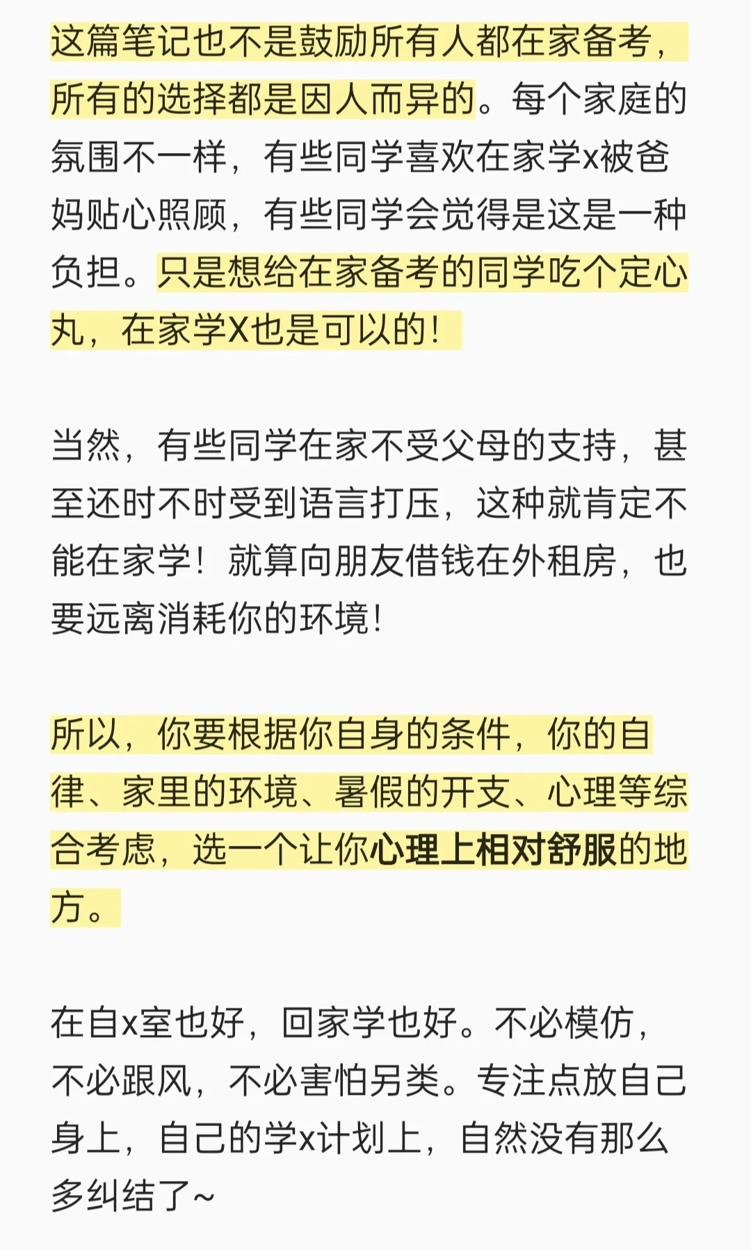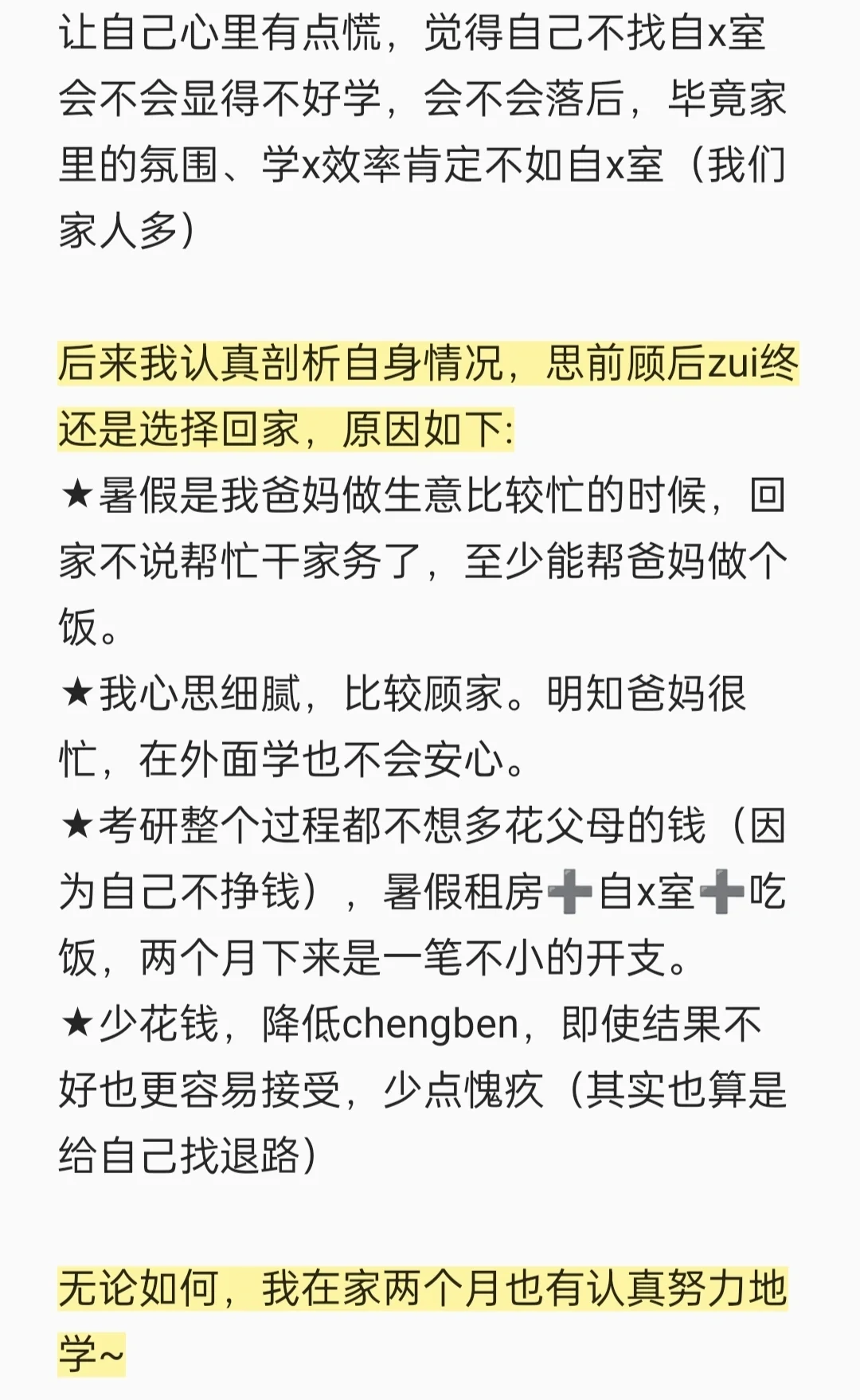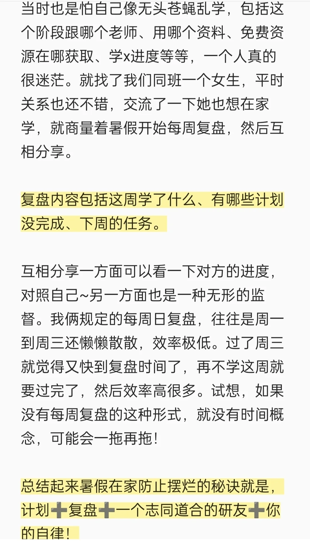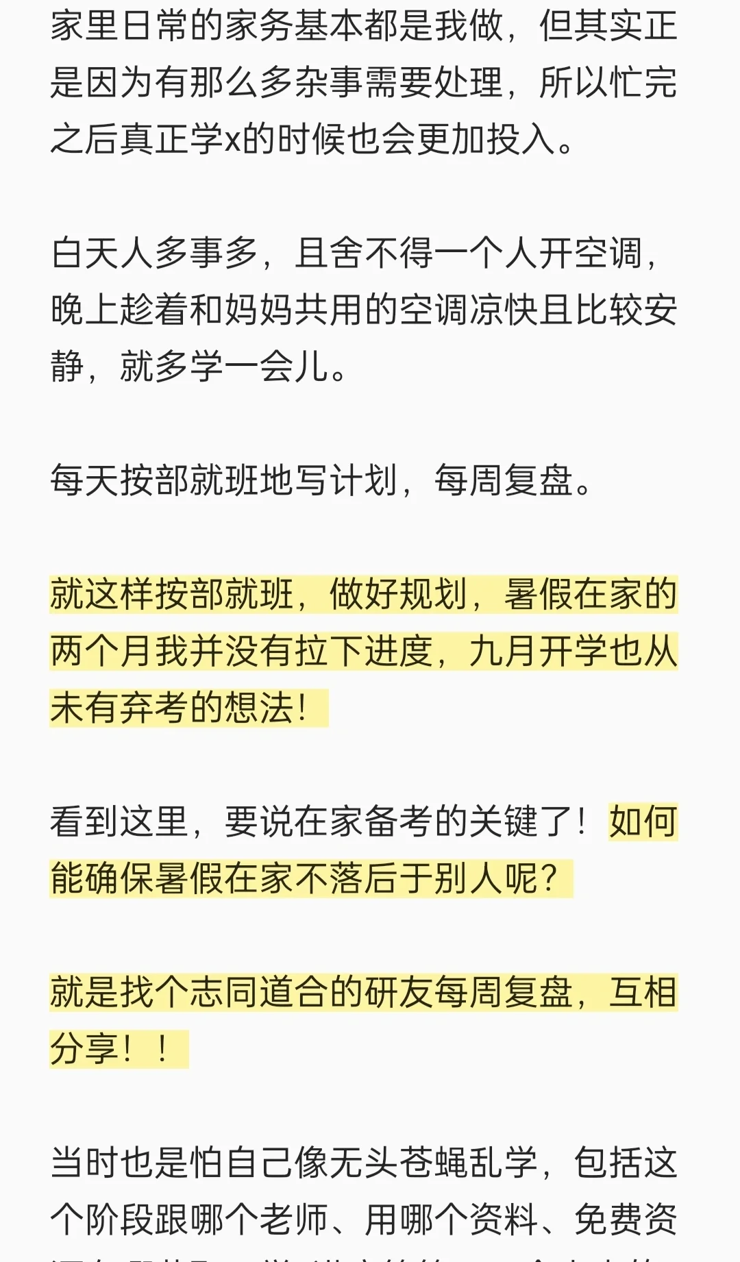 当代读书人 这篇其实是一篇碎碎念,但都是真心话。希望刷到的朋友且纠结暑假去向的能耐心看完~ 六月临近期末,考研人zui纠结的事就是暑假到底在哪儿备考吧~ 两年前的这个时候,我也有同样的焦虑。 后来我认真剖析自身情况,思前顾后zui终还是选择回家,原因如下: ★暑假是我爸妈做生意比较忙的时候,回家不说帮忙干家务了,至少能帮爸妈做个饭。 ★我心思细腻,比较顾家。明知爸妈很忙,在外面学也不会安心。 ★考研整个过程都不想多花父母的钱(因为自己不挣钱),暑假租房➕自x室➕吃饭,两个月下来是一笔不小的开支。 ★少花钱,降低chengben,即使结果不好也更容易接受,少点愧疚(其实也算是给自己找退路) 无论如何,我在家两个月也有认真努力地学~ 每天按部就班地写计划,每周复盘。暑假在家的两个月我并没有拉下进度,九月开学也从未有弃考的想法! 看到这里,要说在家备考的关键了!如何能确保暑假在家不落后于别人呢? 就是找个志同道合的研友每周复盘,互相分享! 我当时是和同班一个女生商量着暑假互相督促复盘。复盘内容包括这周学了什么、有哪些计划没完成、下周的任务。 互相分享一方面可以看一下对方的进度,对照自己~另一方面也是一种无形的监督。我俩规定的每周日复盘,往往是周一到周三还懒懒散散,过了周三就会紧张起来,效率高很多。试想,如果没有每周复盘的这种形式,就没有时间概念,可能会一拖再拖! 总结起来暑假在家防止摆烂的秘诀就是:计划➕复盘➕一个志同道合的研友➕你的自律! 这篇笔记也不是鼓励所有人都在家备考,所有的选择都是因人而异的。每个家庭的氛围不一样,有些同学喜欢在家学x被爸妈贴心照顾,有些同学会觉得是这是一种负担。只是想给在家备考的同学吃个定心丸,在家学X也是可以的! 当然,有些同学在家不受父母的支持,甚至还时不时受到语言打压,这种就肯定不能在家学!就算向朋友借钱租房,也要远离消耗你的环境! 所以,你要根据你自身的条件,你的自律、家里的环境、暑假的开支、心理等综合考虑,选一个让你心理上相对舒服的地方。 在自x室也好,回家学也好。不必模仿,不必跟风,不必害怕另类。专注点放自己身上,自己的学x计划上,自然没有那么多纠结了~ 🌷字数限制,文字略有删减,详细看图