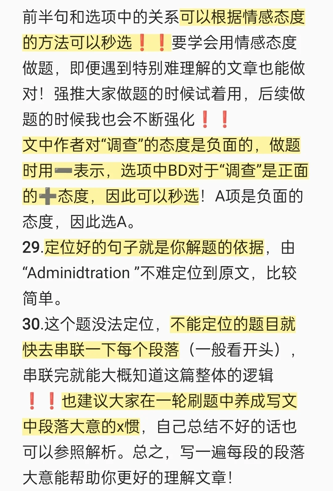 ❗❗也建议大家在一轮刷题中养成写文中段落大意的x惯,自己总结不好的话也可以参照解析。总之,写一遍每段的段落大意能帮助你更好的理解文章!