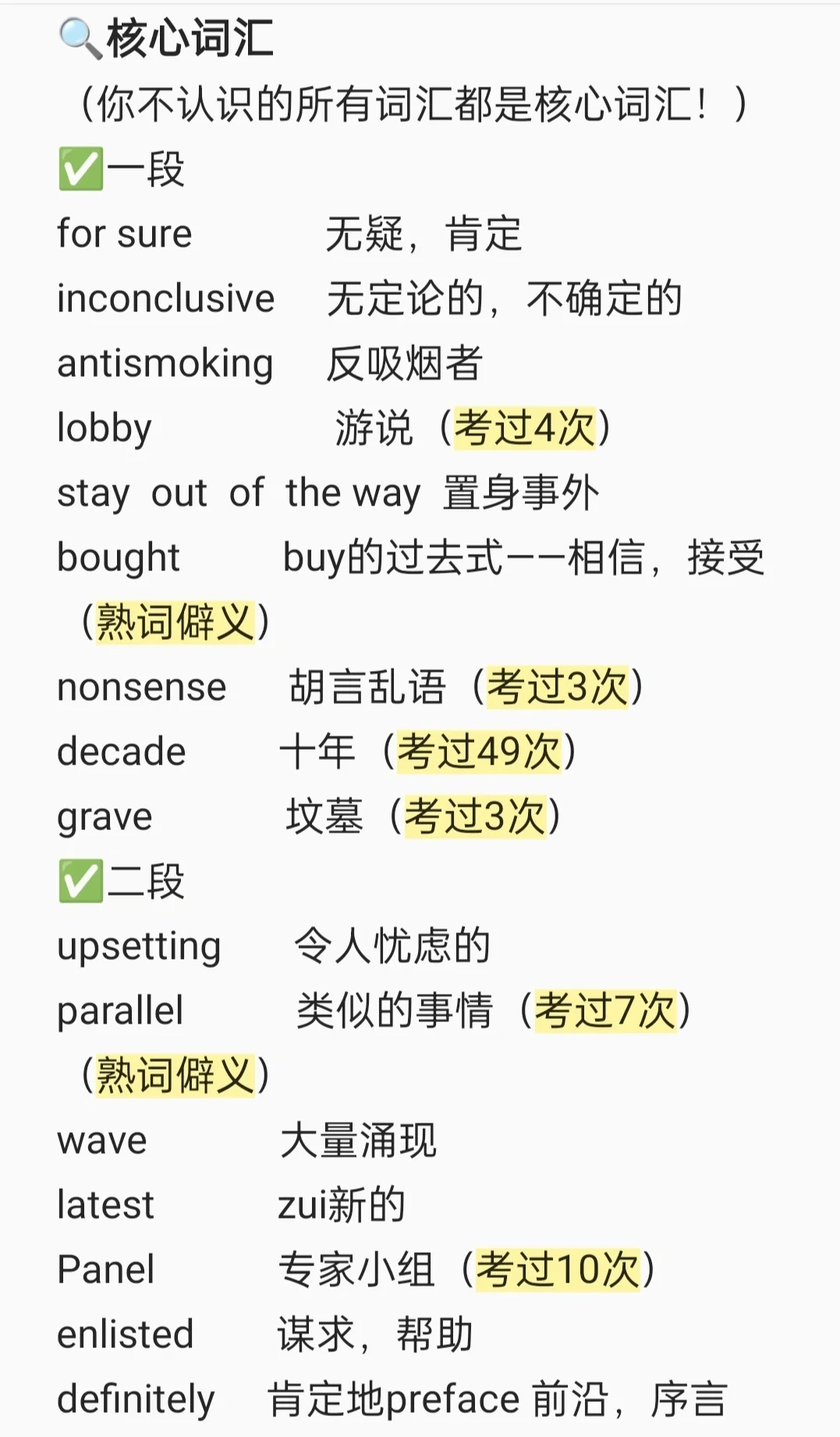 文中标注的是我认为必须要掌握的词汇!仍有很多简单同时也是核心词汇的并未标记。所以建议大家根据自己实际情况做笔记,你不认识的所有词汇都是核心词汇!