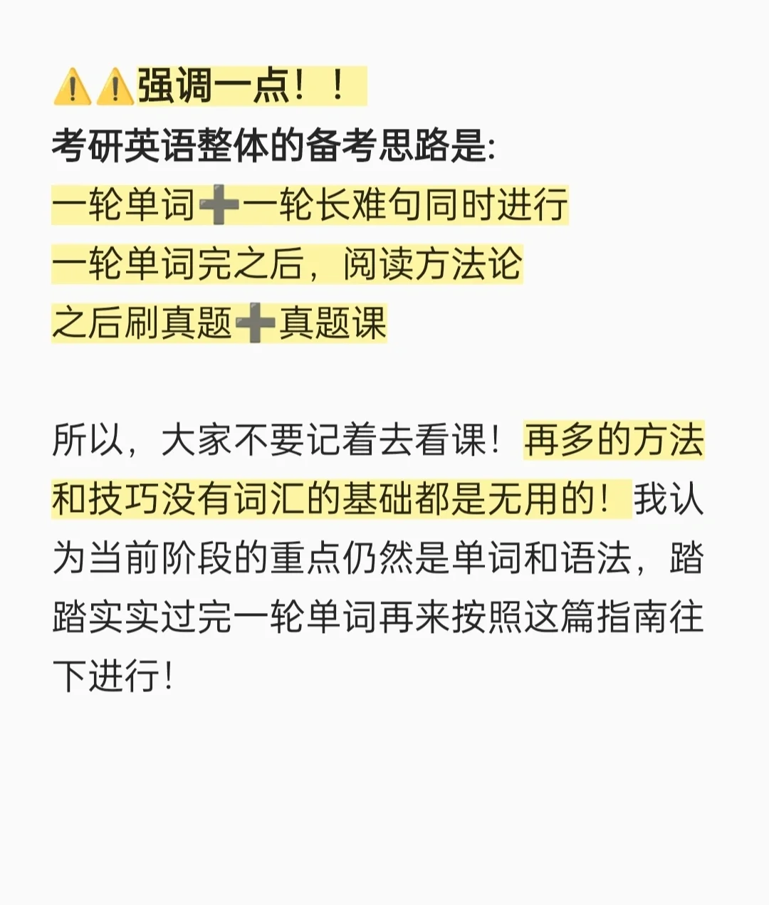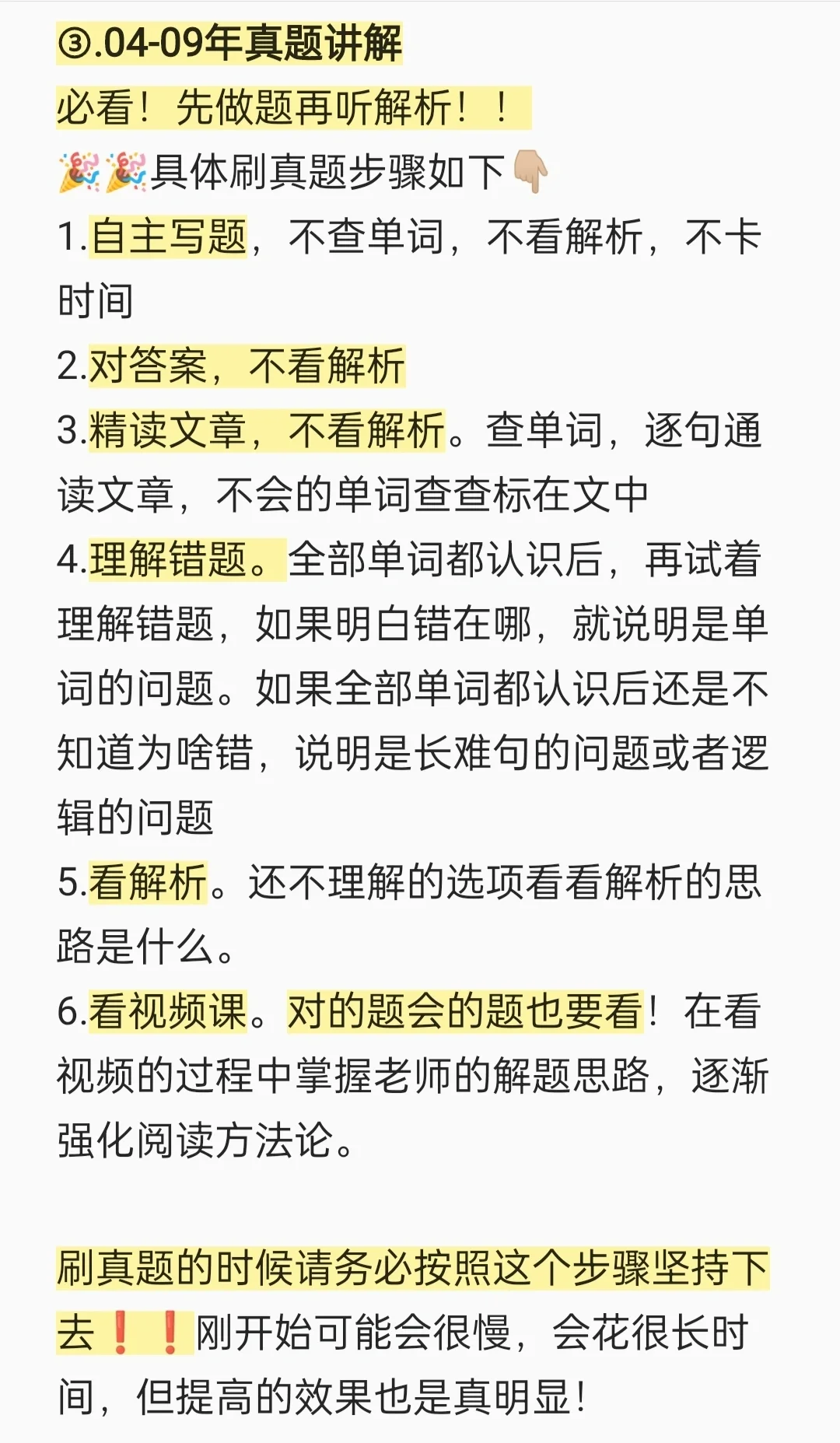 所以,大家不要记着去看课!再多的方法和技巧没有词汇的基础都是无用的!我认为当前阶段的重点仍然是单词和语法,踏踏实实过完一轮单词再来按照这篇指南往下进行!
