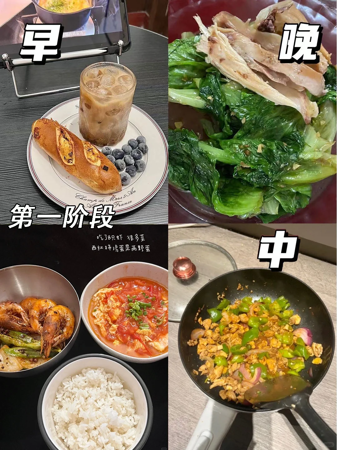 中午:优质碳水+蔬菜+蛋白质(虾,牛肉,鸡胸肉,鸡腿肉)