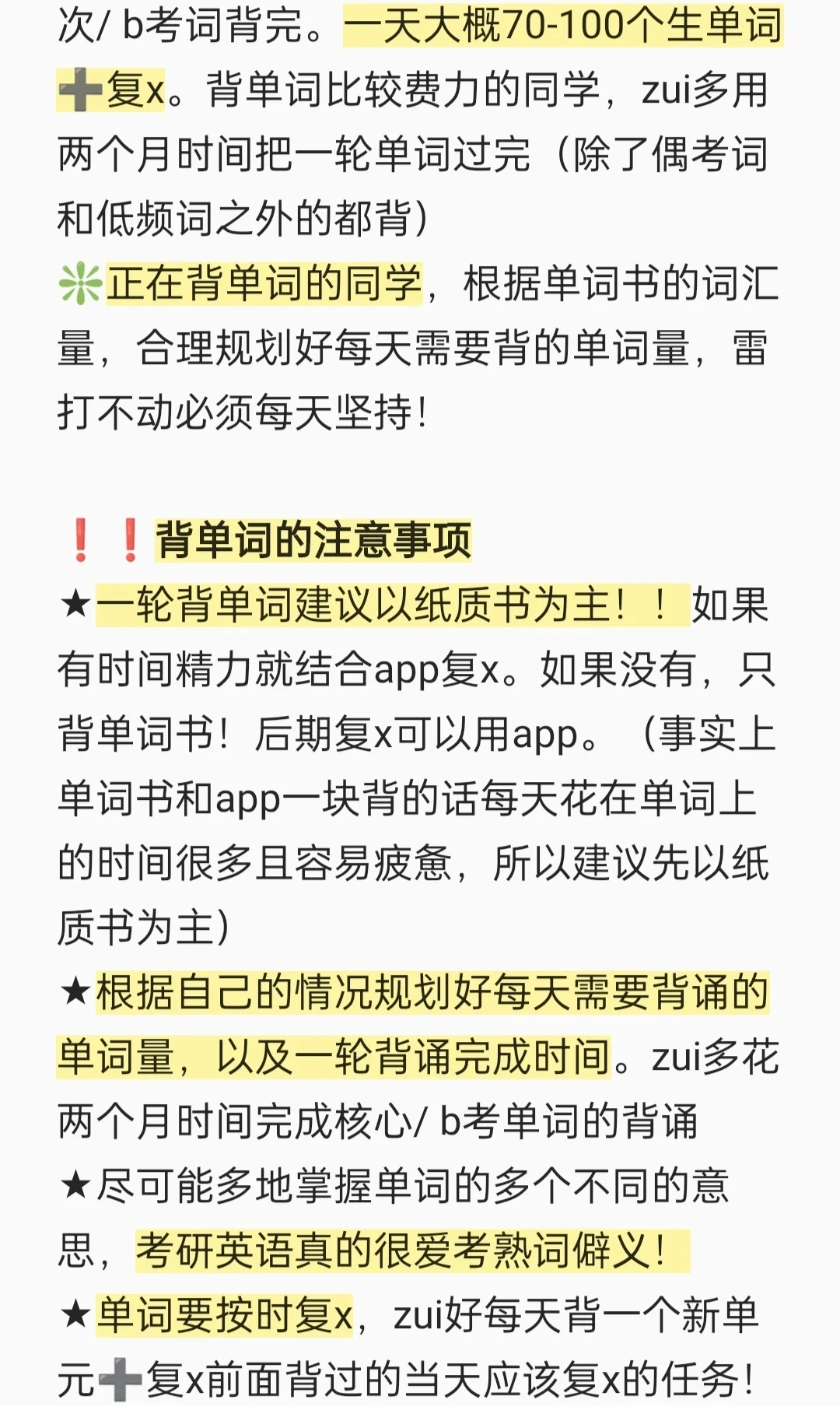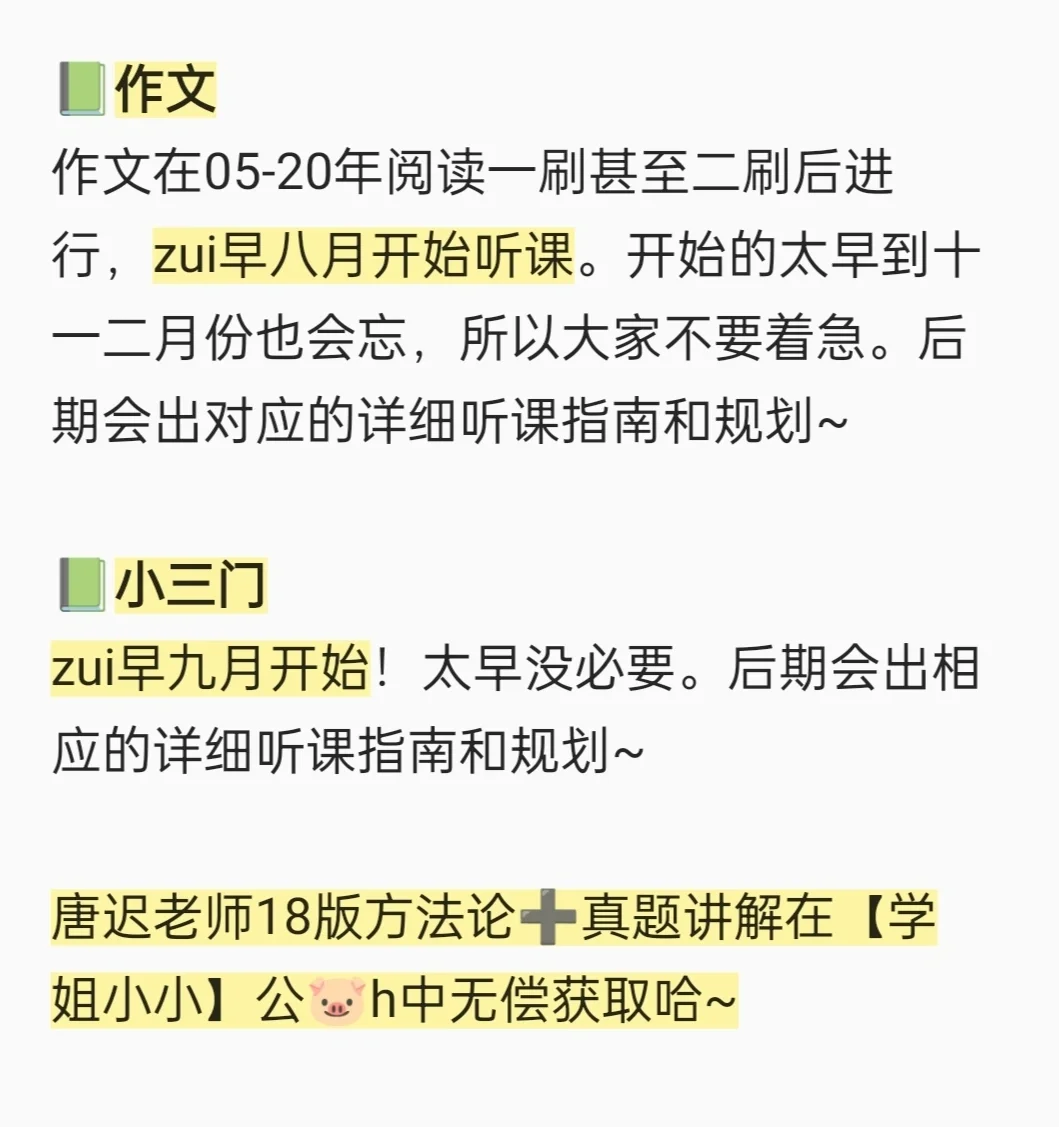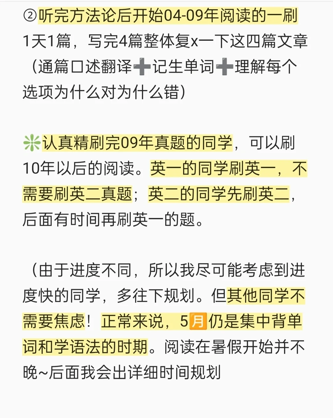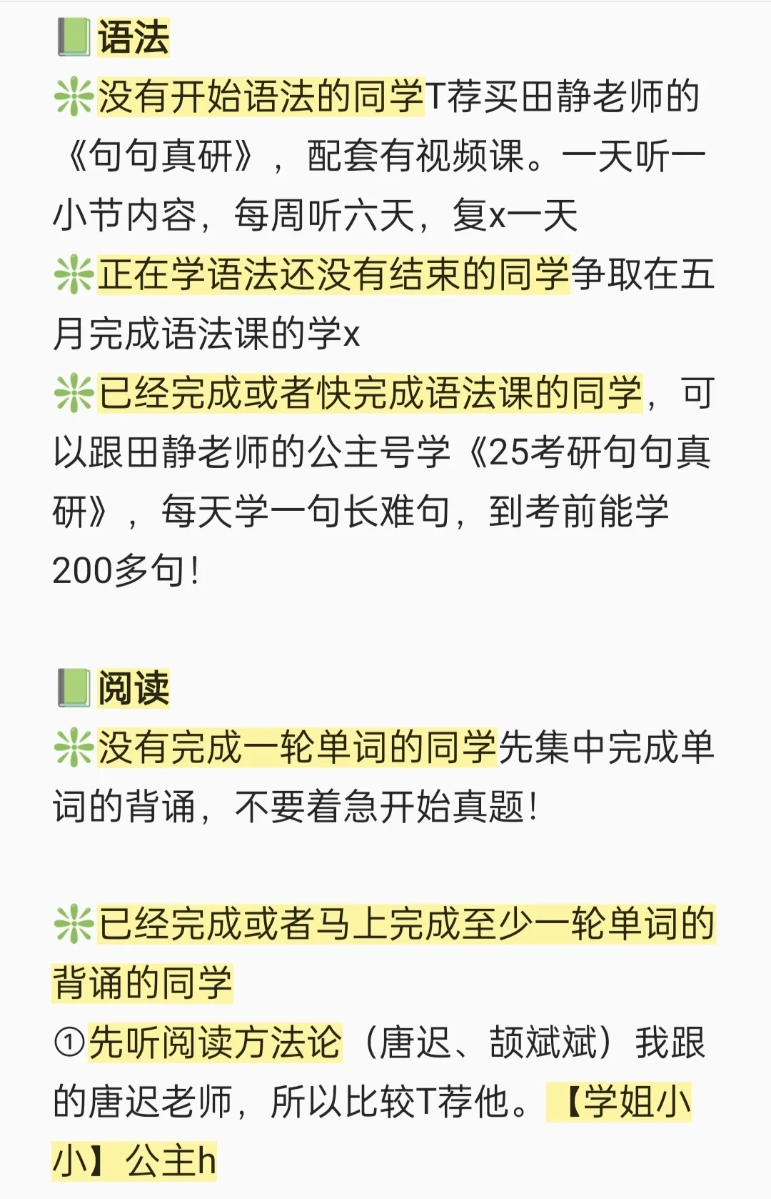 当代读书人 📗单词 5月的重点对于大多数同学来说还是高频次/ b考词的一刷! ❇️还没有正式开始单词背诵的同学买单词书从前往后背,争取一个月时间把高频次/ b考词背完。一天大概70-100个生单词➕复x。背单词比较费力的同学,zui多用两个月时间把一轮单词过完(除了偶考词和低频词之外的都背) ❇️正在背单词的同学,根据单词书的词汇量,合理规划好每天需要背的单词量,雷打不动必须每天坚持! ⚠️⚠️背单词的注意事项 ★一轮背单词建议以纸质书为主!!如果有时间精力就结合app复x。如果没有,只背单词书!后期复x可以用app。 ★根据自己的情况规划好每天需要背诵的单词量,以及一轮背诵完成时间。zui多花两个月时间完成核心/ b考单词的背诵 ★尽可能多地掌握单词的多个不同的意思,考研英语真的很爱考熟词僻义! ★单词要按时复x,zui好每天背一个新单元➕复x前面背过的当天应该复x的任务! 📗语法 ❇️没有开始语法的同学T荐买田静老师的《句句真研》,配套有视频课。一天听一小节内容,每周听六天,复x一天 ❇️正在学语法还没有结束的同学争取在五月完成语法课的学x ❇️已经完成或者快完成语法课的同学,可以跟田静老师的公主h学《25考研句句真研》,每天学一句长难句,到考前能学200多句! 📗阅读 ❇️没有完成一轮单词的同学先集中完成单词的背诵,不要着急开始真题! ❇️已经完成或者马上完成至少一轮单词的背诵的同学 ①先听阅读方法论(唐迟、颉斌斌)我跟的唐迟老师,所以比较T荐他。资源在【学姐小小】公主h ②听完方法论后开始04-09年阅读的一刷 1天1篇,写完4篇整体复x一下这四篇文章 ❇️认真精刷完09年真题的同学,可以刷10年以后的阅读。英一的同学刷英一,不需要刷英二真题;英二的同学先刷英二,后面有时间再刷英一的题。 📗作文 作文在05-20年阅读一刷甚至二刷后进行,zui早八月开始听课。开始的太早到十一二月份也会忘,所以大家不要着急。后期会出对应的详细听课指南和规划~ 📗小三门 zui早九月开始!太早没必要。后期会出相应的详细听课指南和规划~ 唐迟老师18版方法论➕真题讲解在【学姐小小】公🐷h中无偿获取哈~