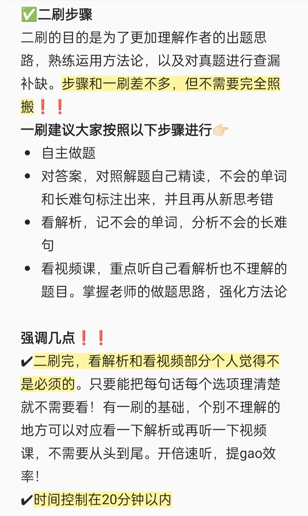 二刷的目的是为了更加理解作者的出题思路,熟练运用方法论,以及对真题进行查漏补缺。步骤和一刷差不多,但不需要完全照搬❗❗