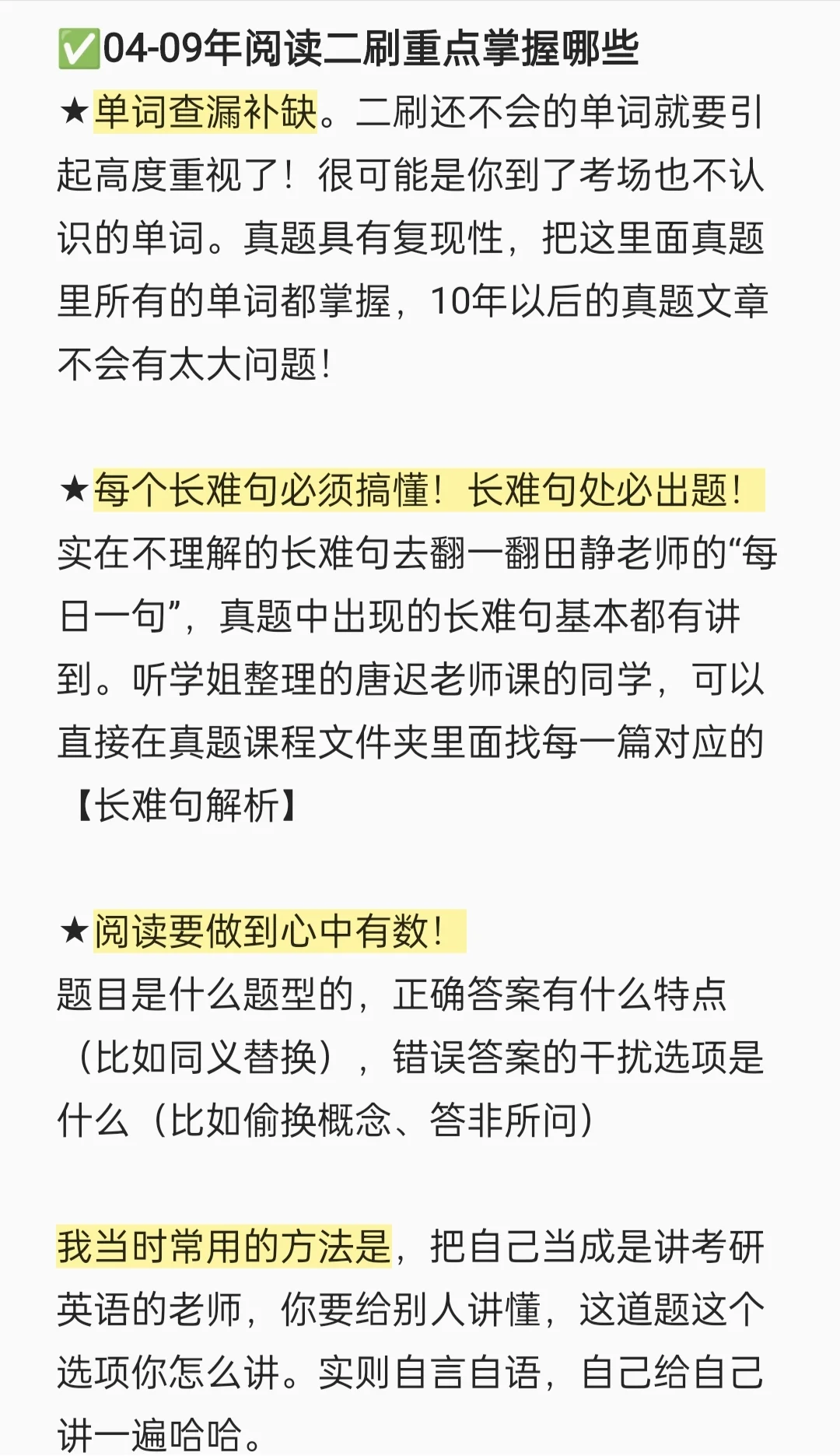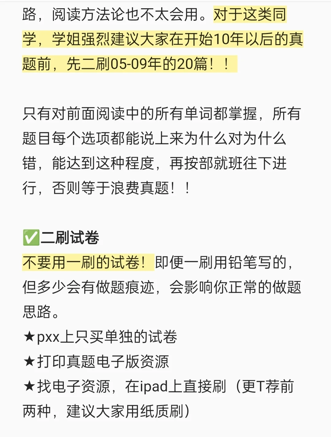 还有一部分大概在六月开始做阅读,这几天也将05-09年的20篇阅读一刷完了!但还是感觉稀里糊涂,好像没有真正明白阅读的套路,阅读方法论也不太会用。对于这类同学,学姐强烈建议大家在开始10年以后的真题前,先二刷05-09年的20篇!!