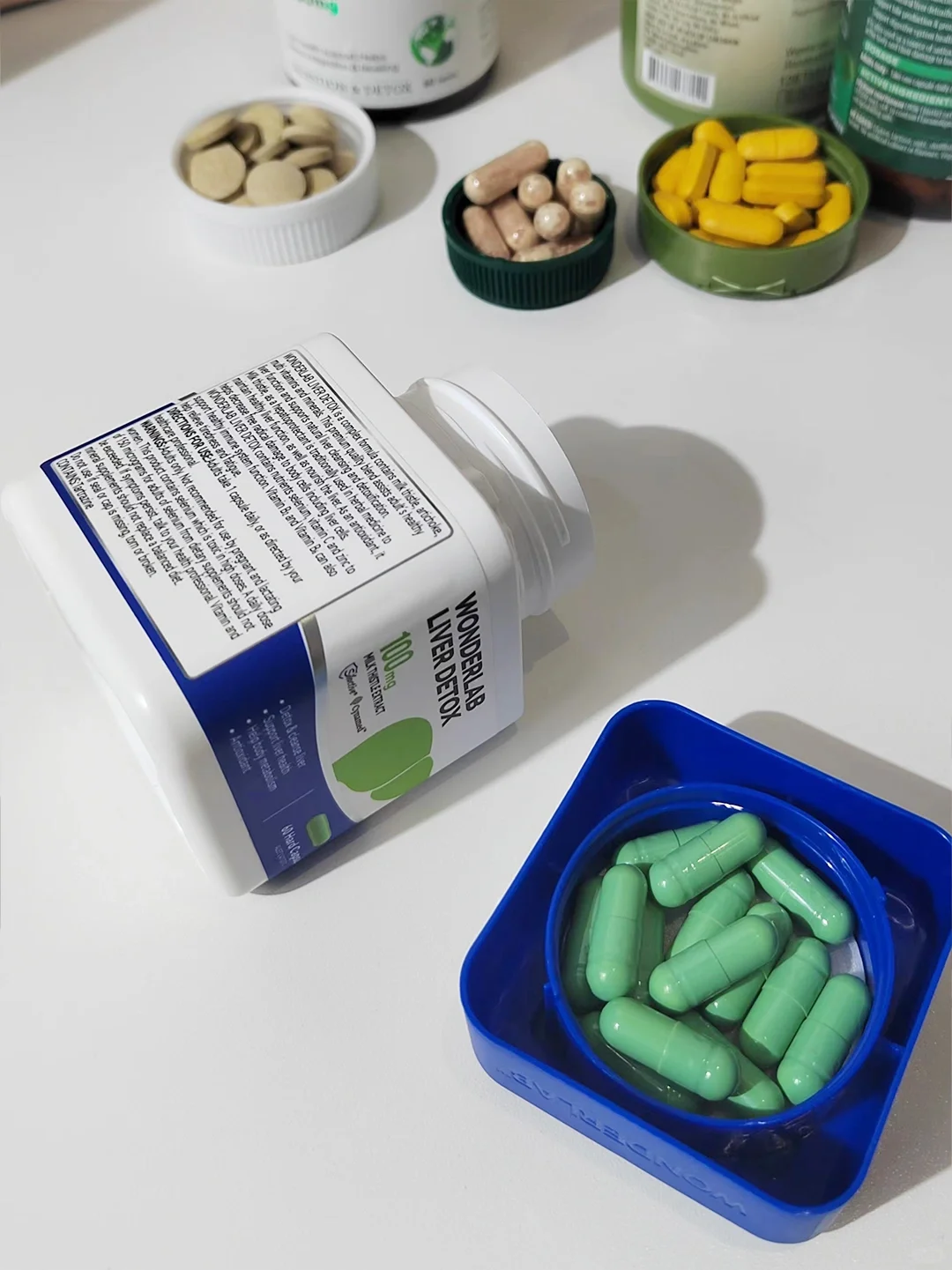 这个我吃起来整体来说效果还是不错的,蓝色小罐子,绿色胶囊,吃起来也没有怪味,还比较容易吞咽,不会卡到喉咙的。