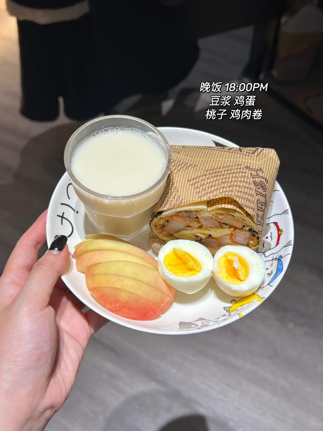 🥣晚饭:鸡肉卷 鸡蛋 豆浆 桃子