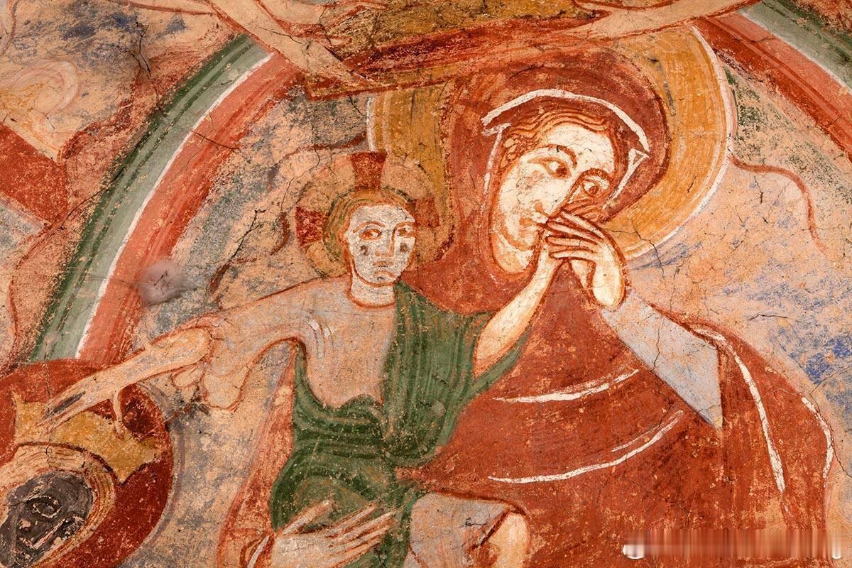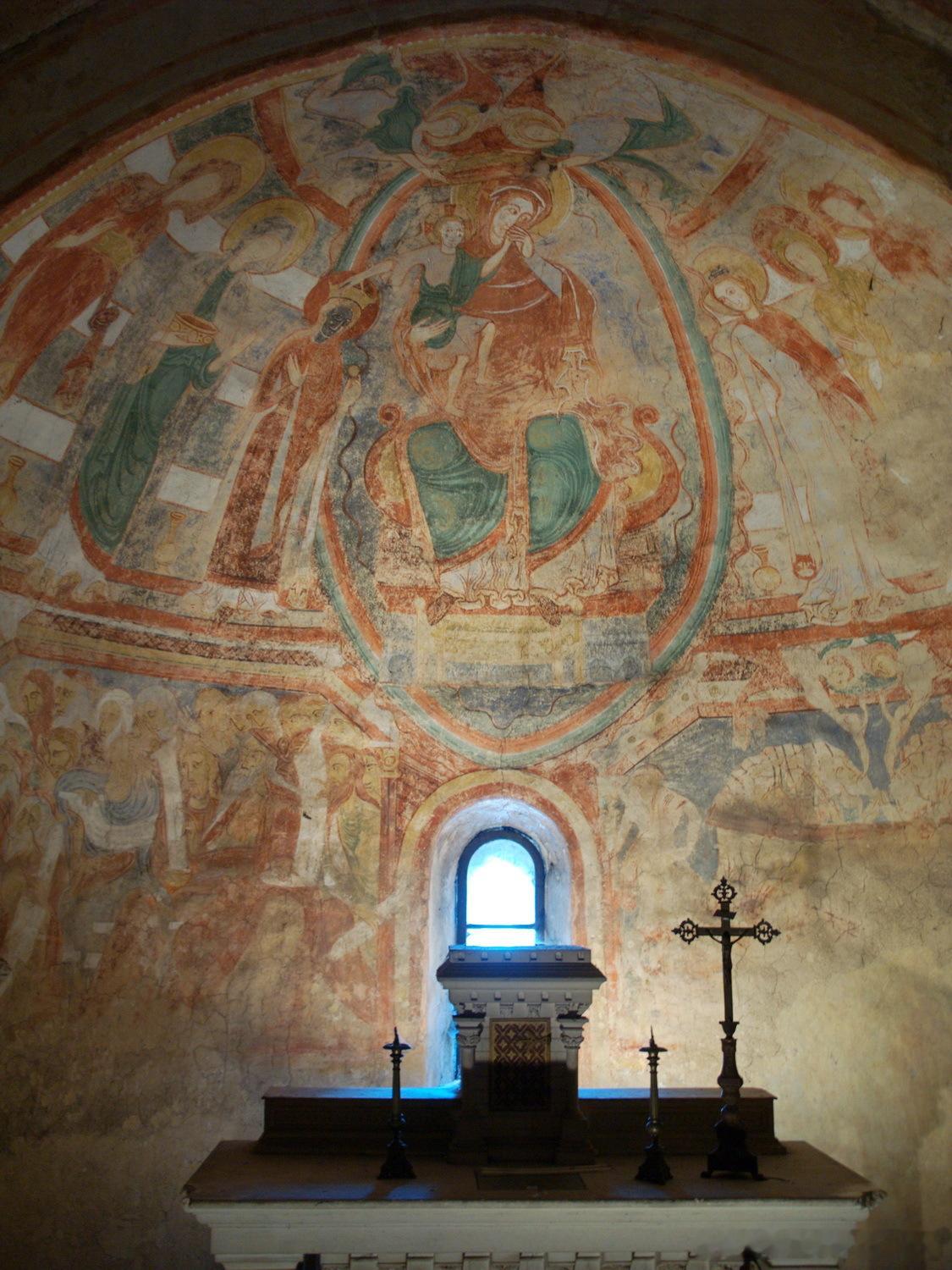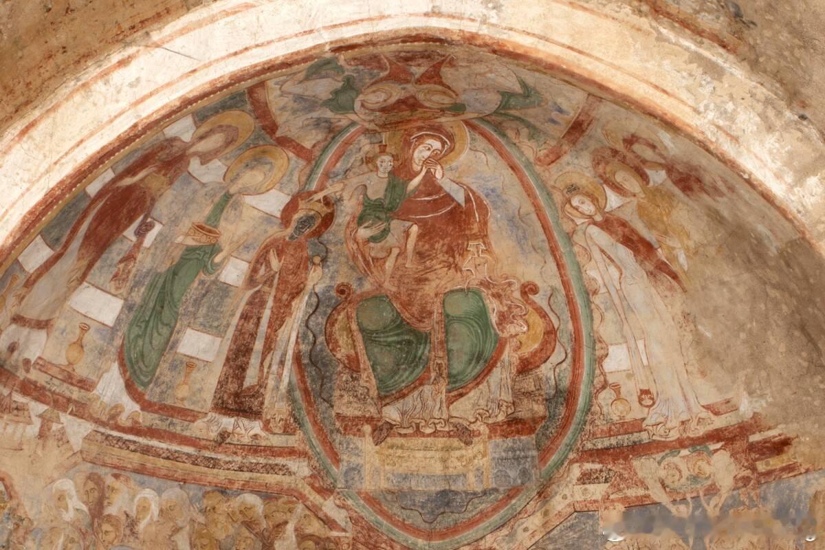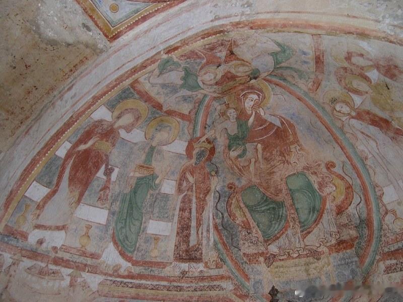 位于法国加尔唐普河畔的蒙特莫里隆圣母教堂,其唱诗班席下方有一间献给圣凯萨琳的礼拜堂。礼拜堂后殿有一幅品质上乘的壁画,中央是宝座圣母位于杏核状光圈中,从天而降的天使为她加冕,圣母右手抱着圣子,并拿起他的左手亲吻;男孩基督的右手平直伸出,为可能是圣凯萨琳,也可能是教会化身的一位身份不明的女性加冕。在有水平条饰与波浪线的背景上,左方有三位拿着冠冕的女性圣徒,另外三位带光环的女性则从右方走来。