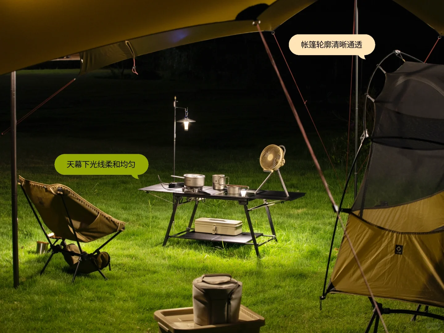 我常用的主灯是Claymore的三面主灯,图里我做一个逆向的光源,向上打亮整个天幕,同时也可以打亮纱网帐篷的轮廓,把纱网通透的质感照出来。