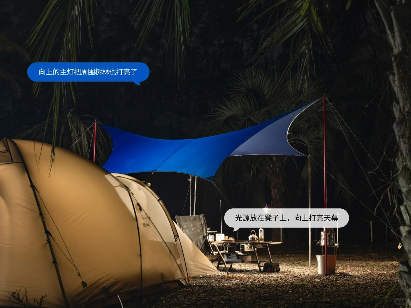 露营夜拍灯光布置的关键在于用一盏主灯向上打亮天幕(或帐篷)让天幕形成漫反射,可以间接均匀的照亮天幕下方区域,这里不适用于黑胶天幕,这也是为什么浅色天幕好拍照的原因。