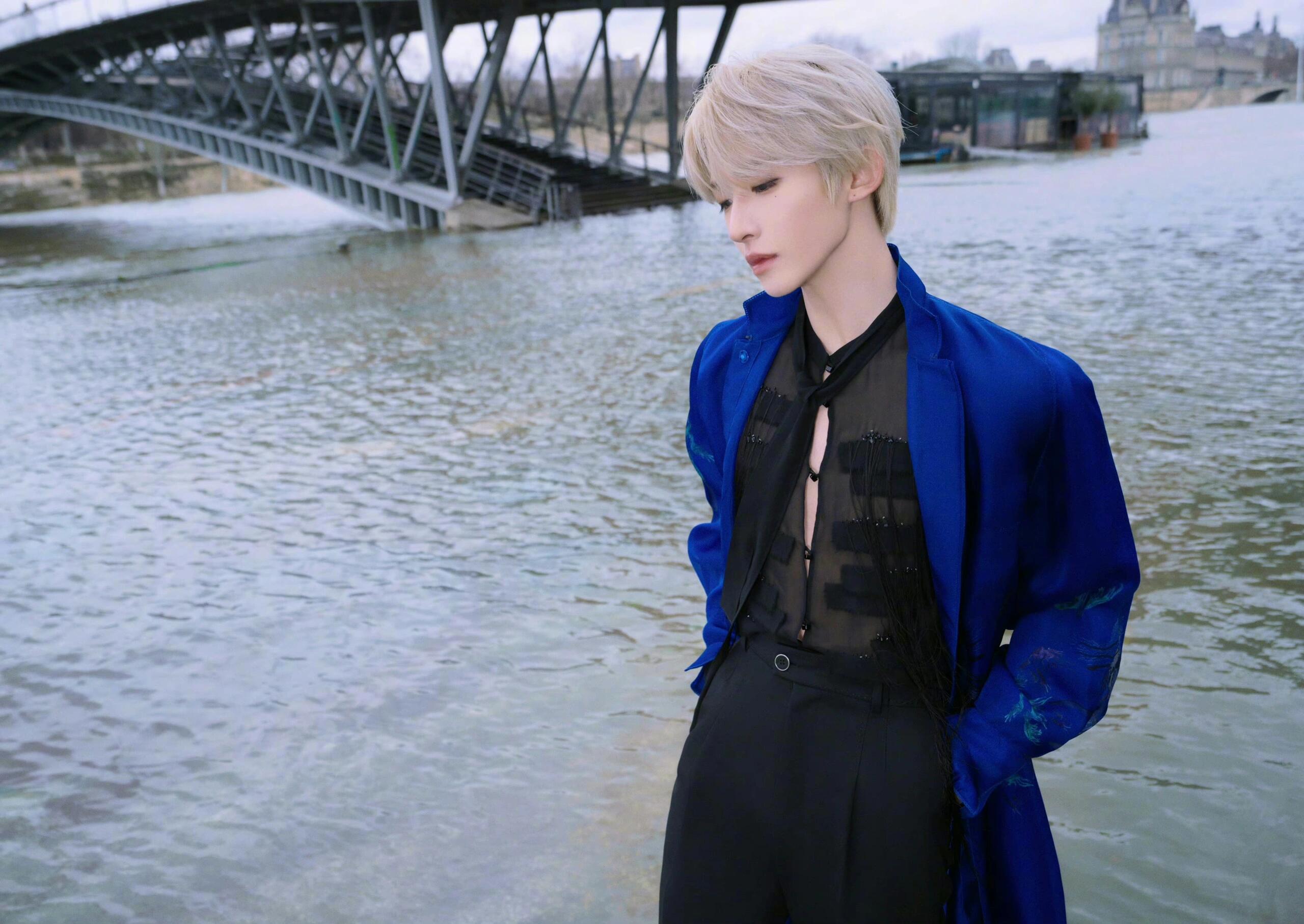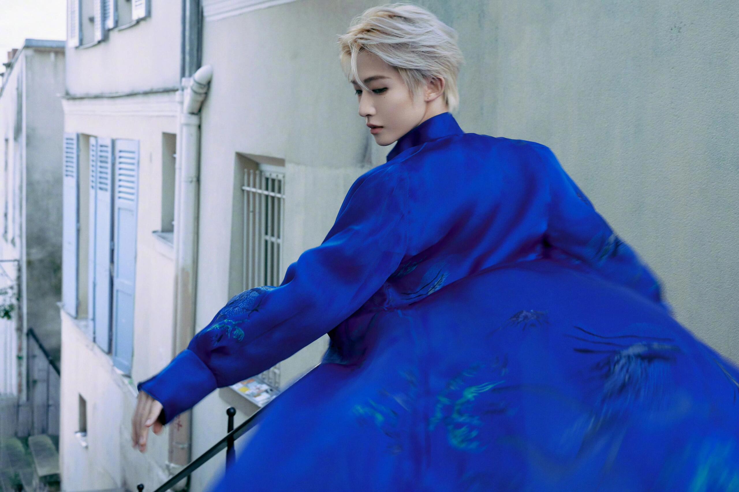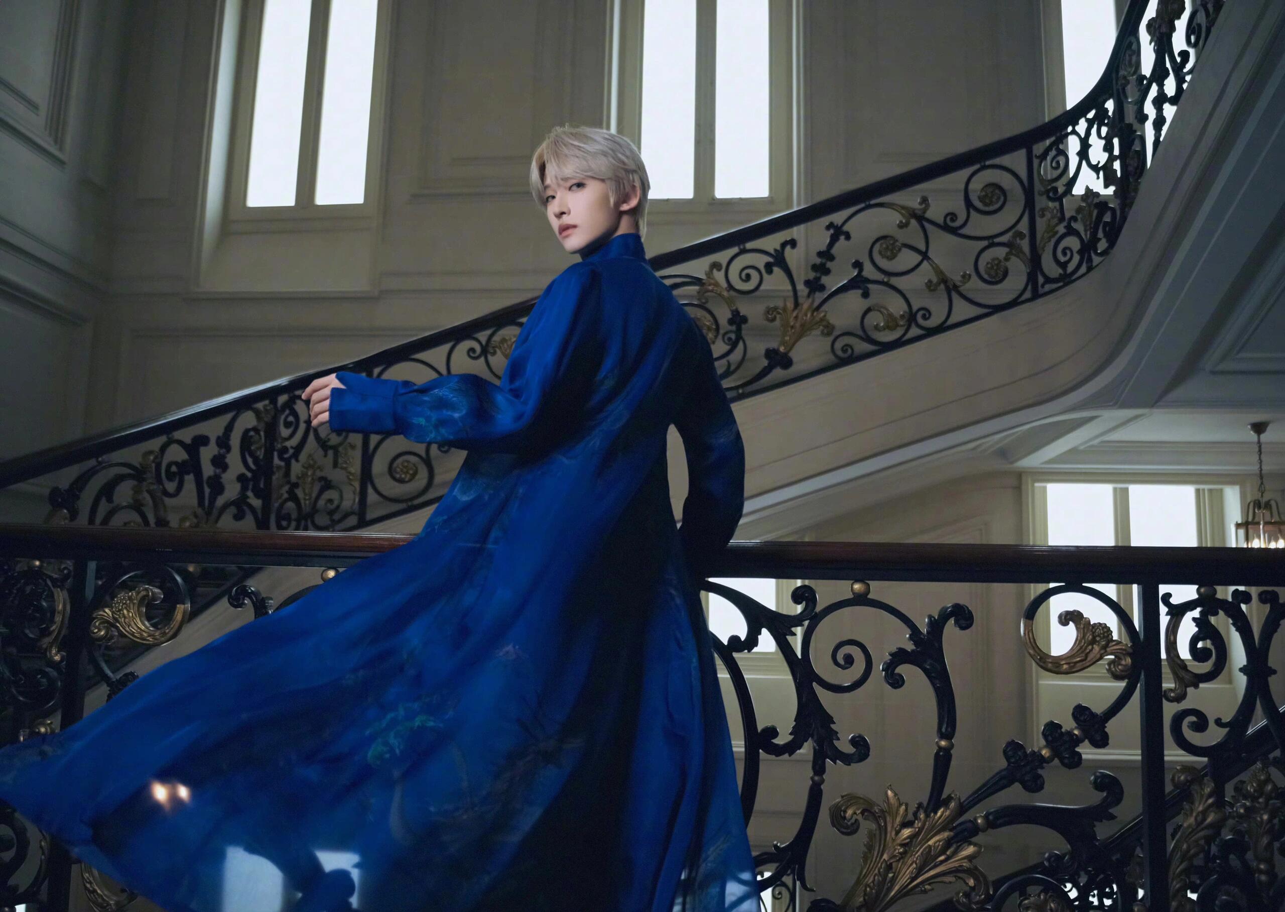 刘宇亮相秋冬大秀,身穿飘逸的蓝色长袍,“蜃龙”形象的繁美印花图样,诠释国风美少年独属的东方诗意