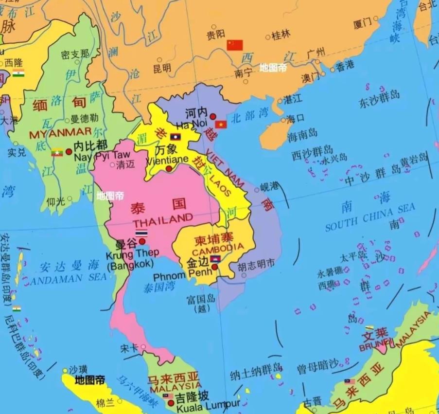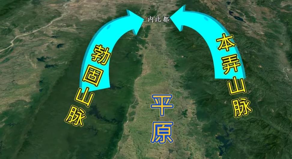 如图所示, 内比都位于该国的中部山区,属于部分平原区 左侧为勃固山脉,右侧为本弄山脉,