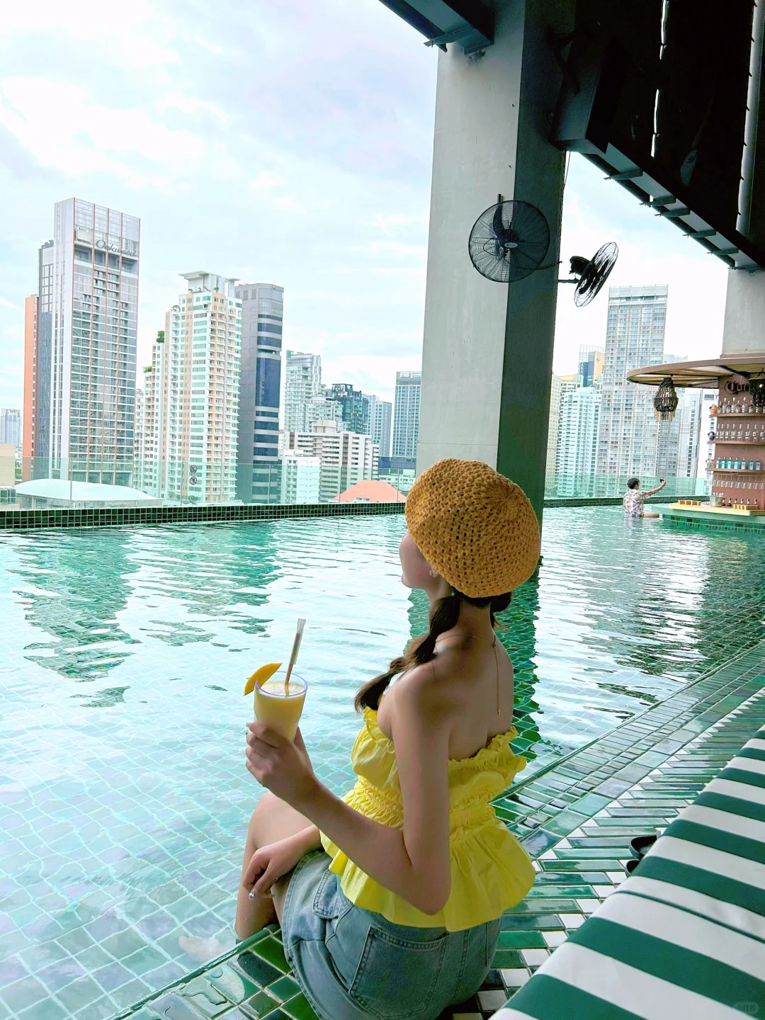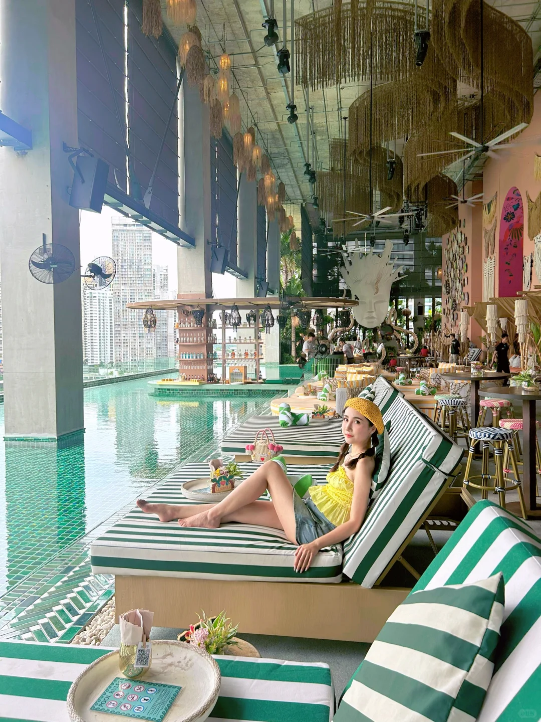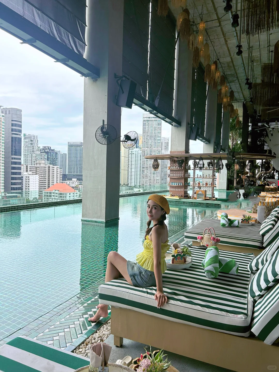 ▪️在泰国曼谷网红商场Emsphere的5F。 真的太Chill了。 - ▪️很幸运这几天曼谷超级凉快。 我中午12:30到的, 不用排队,不用低消,靠近泳池的位置没有一个人, 看来想要美美拍照的还是要早点来。 晚上这里就变成派对氛围了。 饮料价格很美丽,一杯果汁150🐷,也就是30RMB。 - ▪️提供试衣间和冲凉。 可以带着游泳衣来游泳。 -