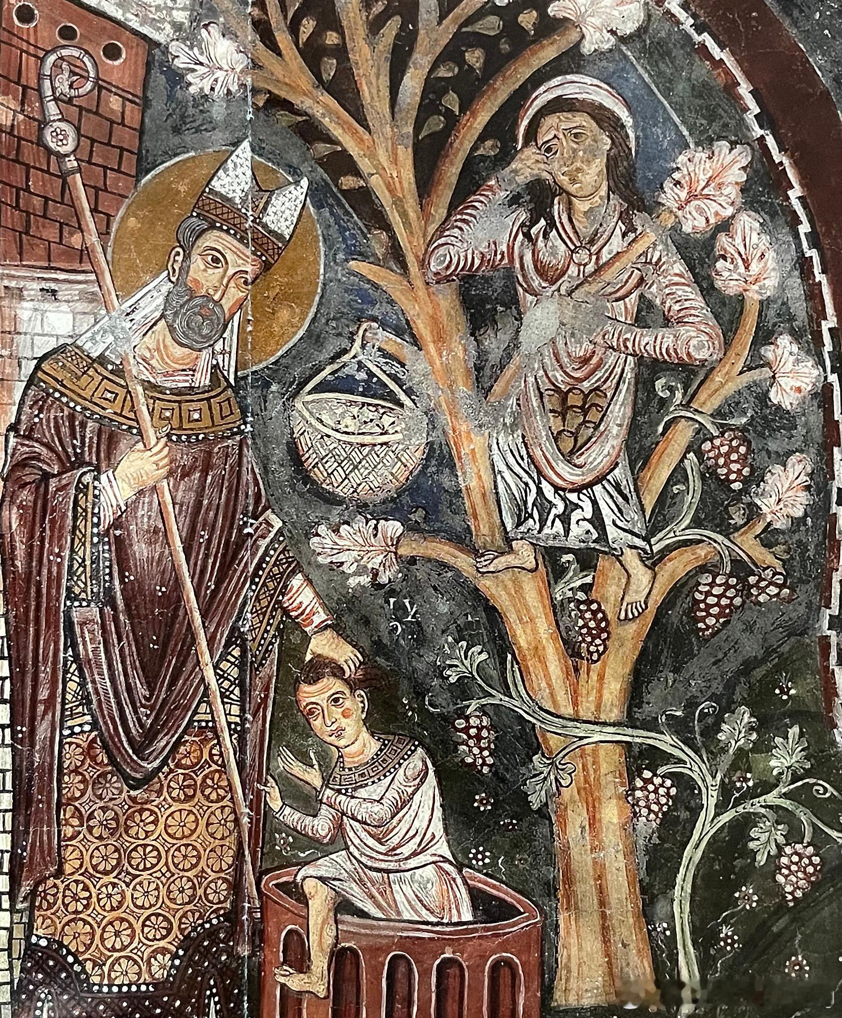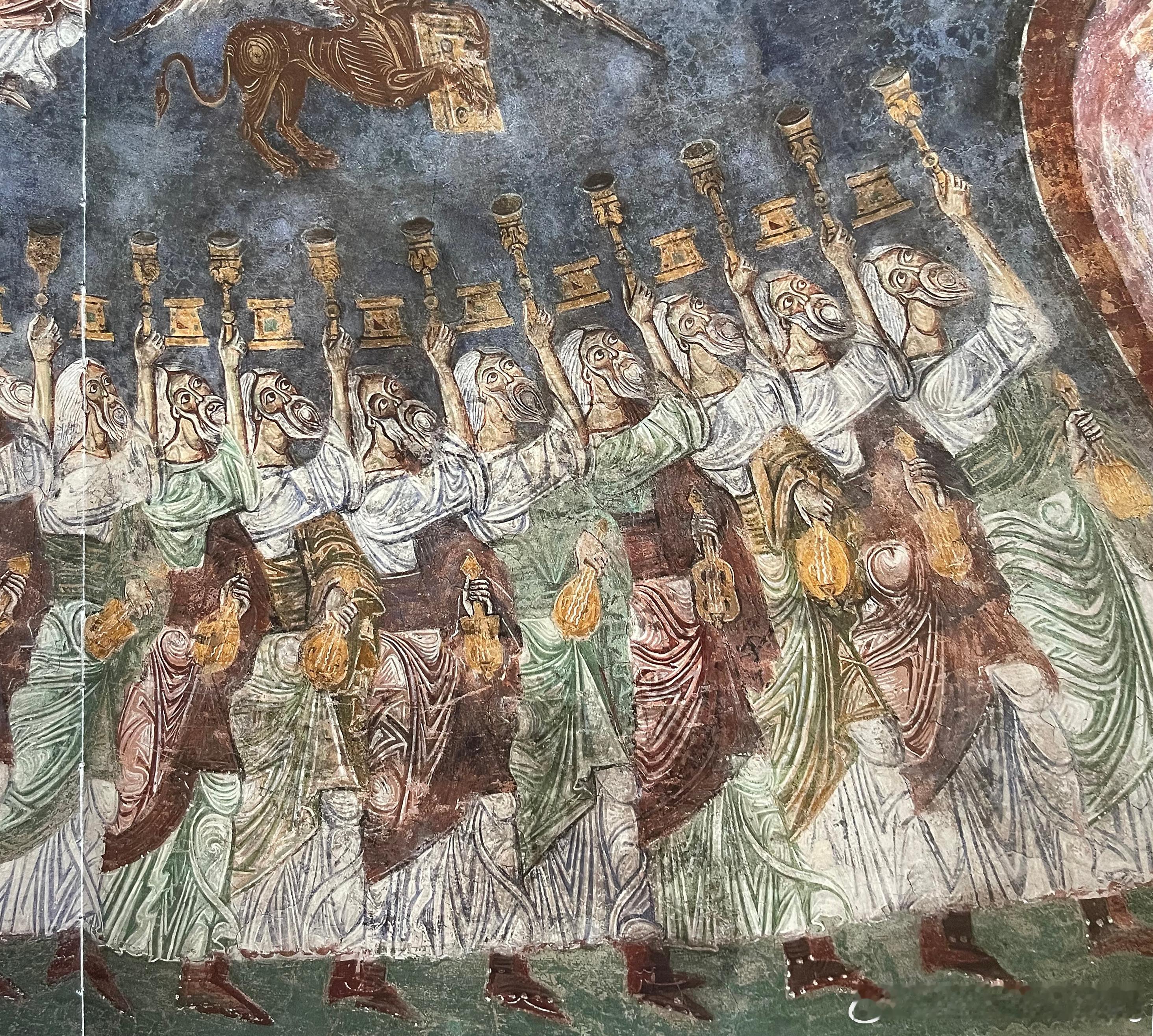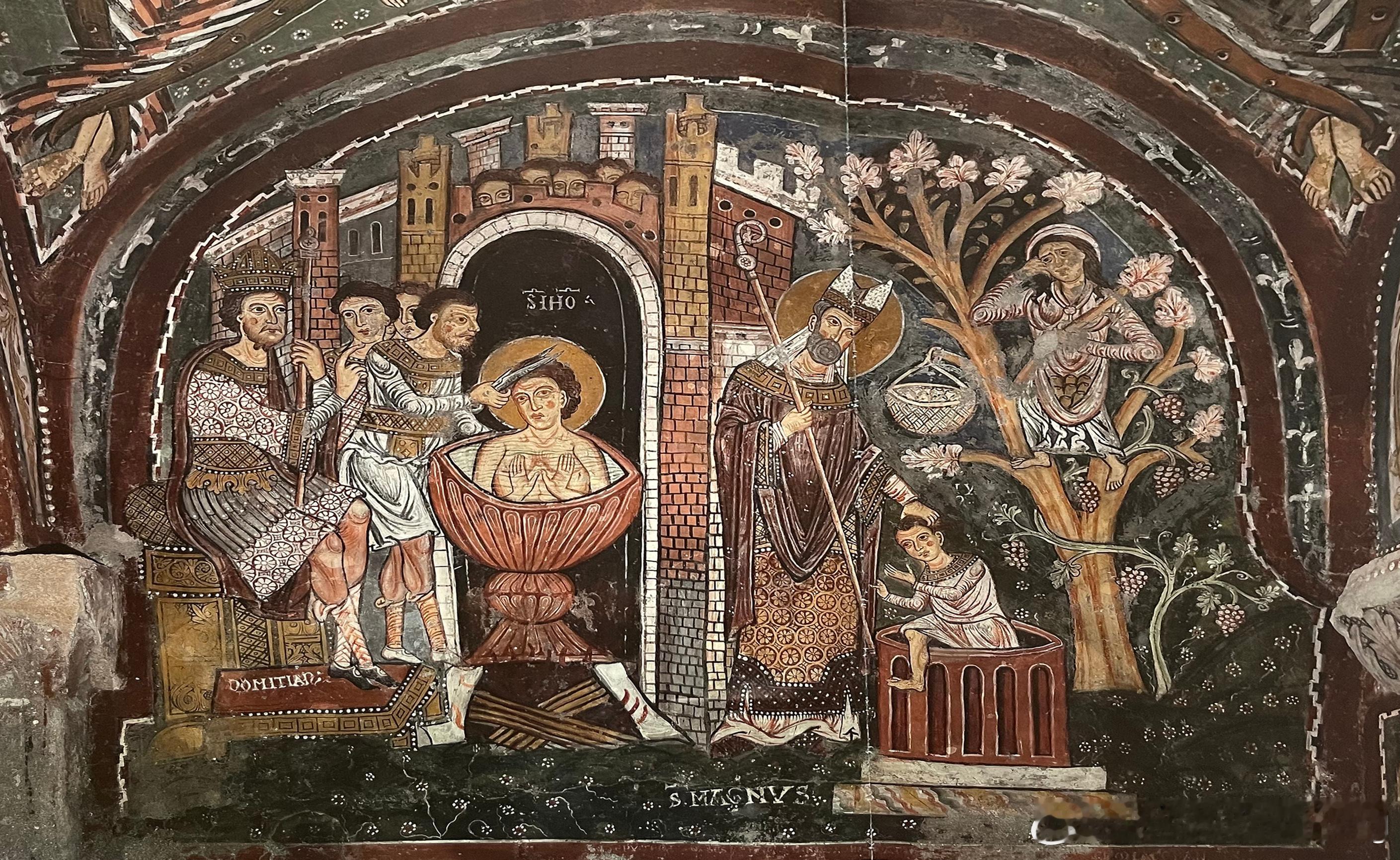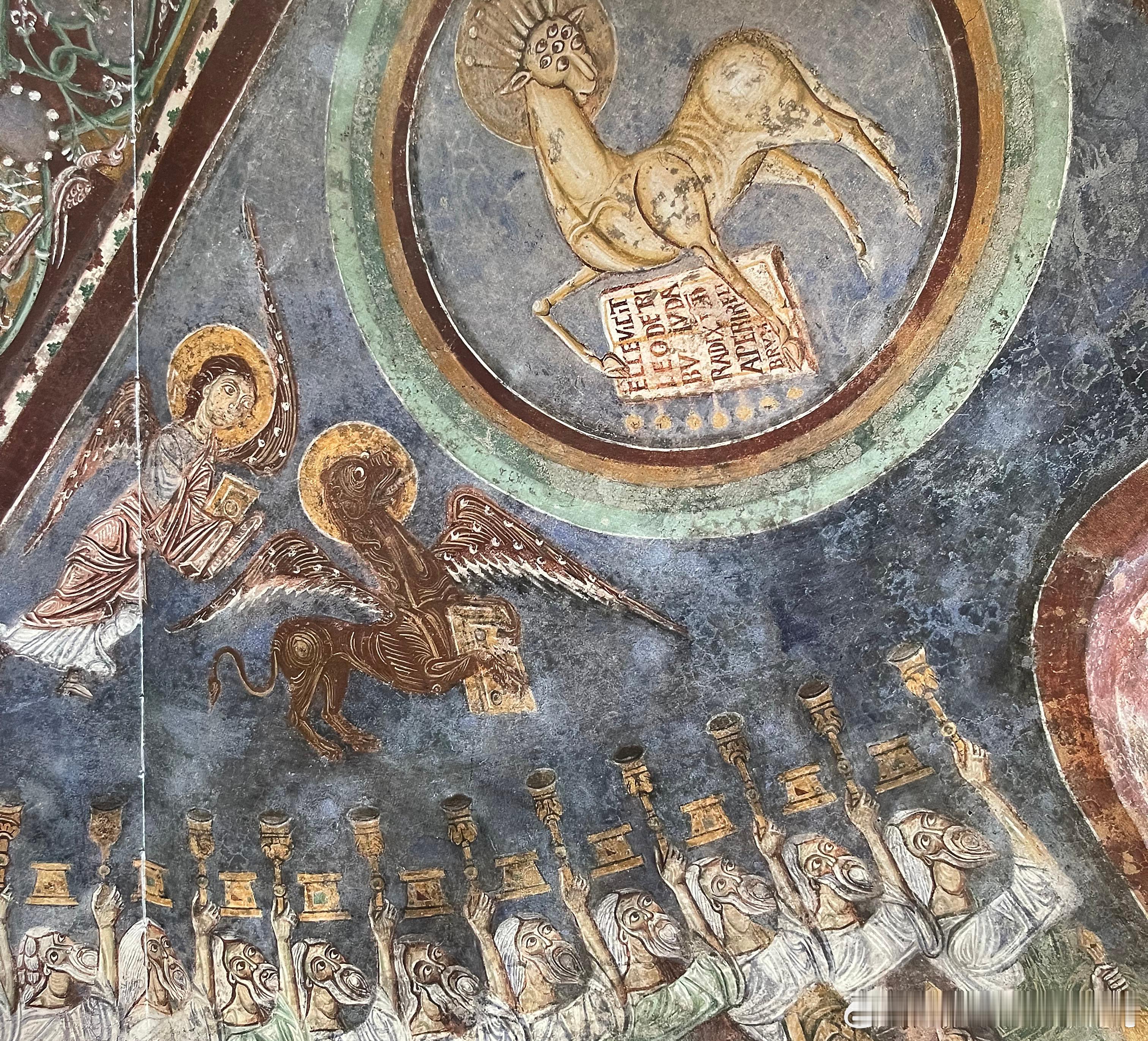 壁画大师的风格仍然被由来已久的罗马壁画传统所主导,他的作品包括位于主后殿前方拱顶的启示录圣像或彩绘装饰。主后殿拱顶描绘《启示录》主题图像,24位长老带着自己的头冠与盛满香的金炉来向上帝之羊致敬,羊的四周是福音书作者象征。这只约翰《启示录》中所描绘的羊以七眼七角的形象出现,前脚中央的书带有七个封印,被赞誉为一本值得展读的书。在《启示录》图像底下,后殿右手边描绘圣马格努斯的圣髑移送到阿纳尼的景象。