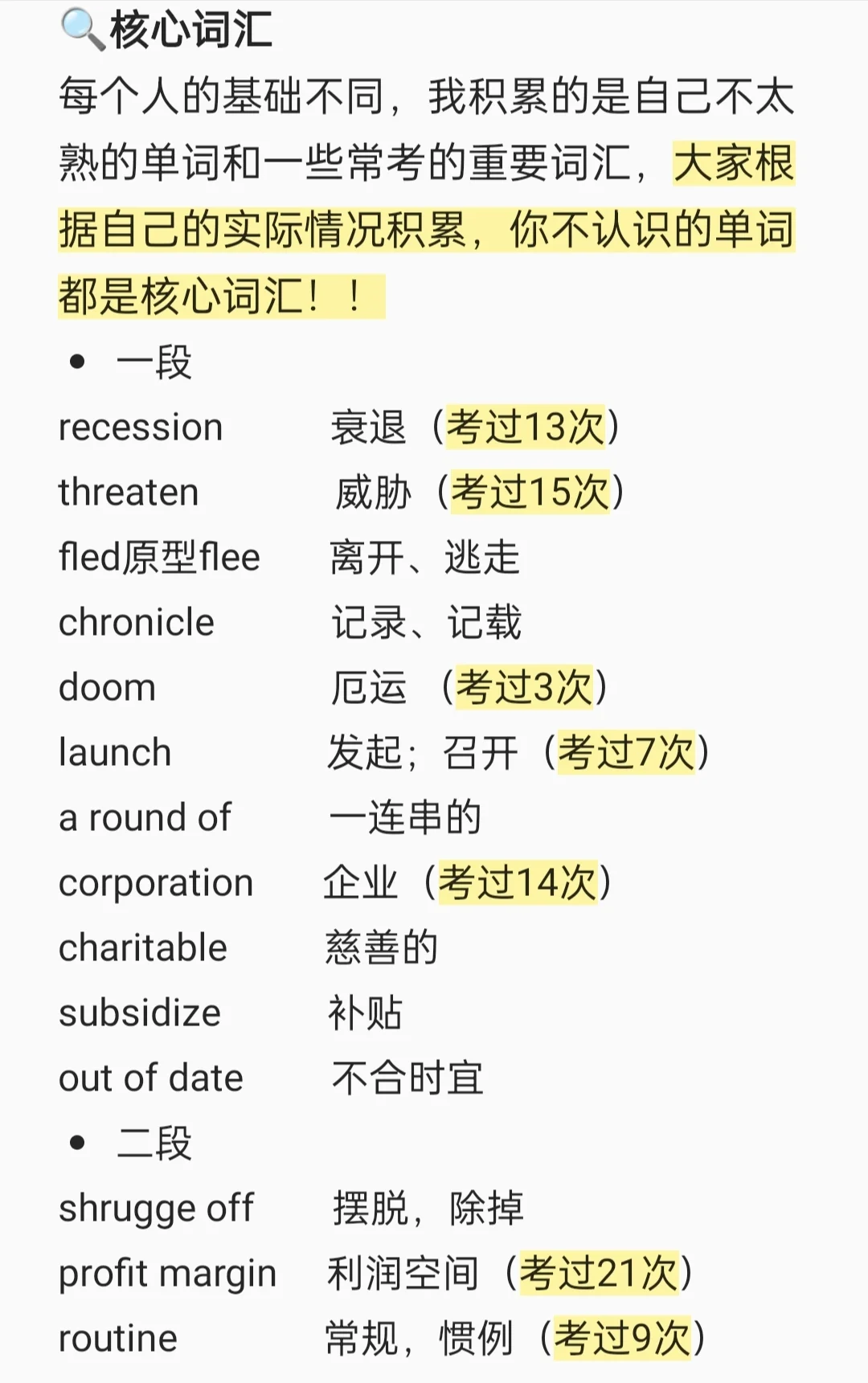 每个人的基础不同,我积累的是自己不太熟的单词和一些常考的重要词汇,大家根据自己的实际情况积累,你不认识的单词都是核心词汇!!