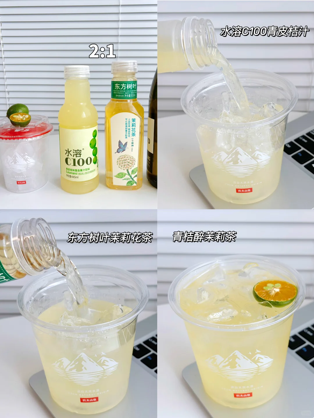 2⃣水溶C100青皮桔汁+白葡萄酒+金桔+东方树叶茉莉花茶+冰杯,轻轻松松get一杯酸酸甜甜的🌸微醺青桔醉茉莉!