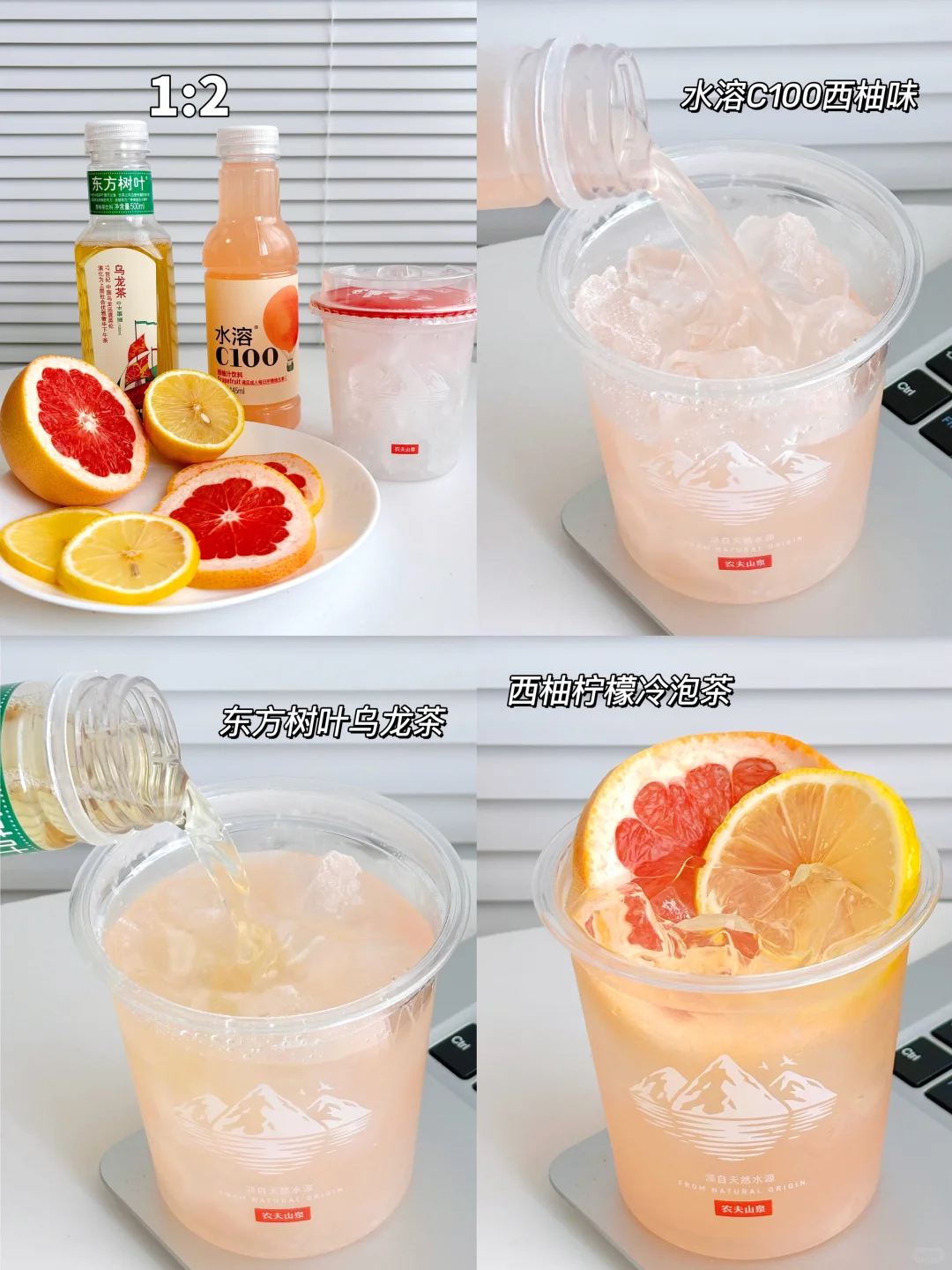 1⃣水溶C100西柚汁+西柚片+柠檬片+东方树叶乌龙茶+冰杯,就是一杯清爽解腻的🍊西柚柠檬冷泡茶!