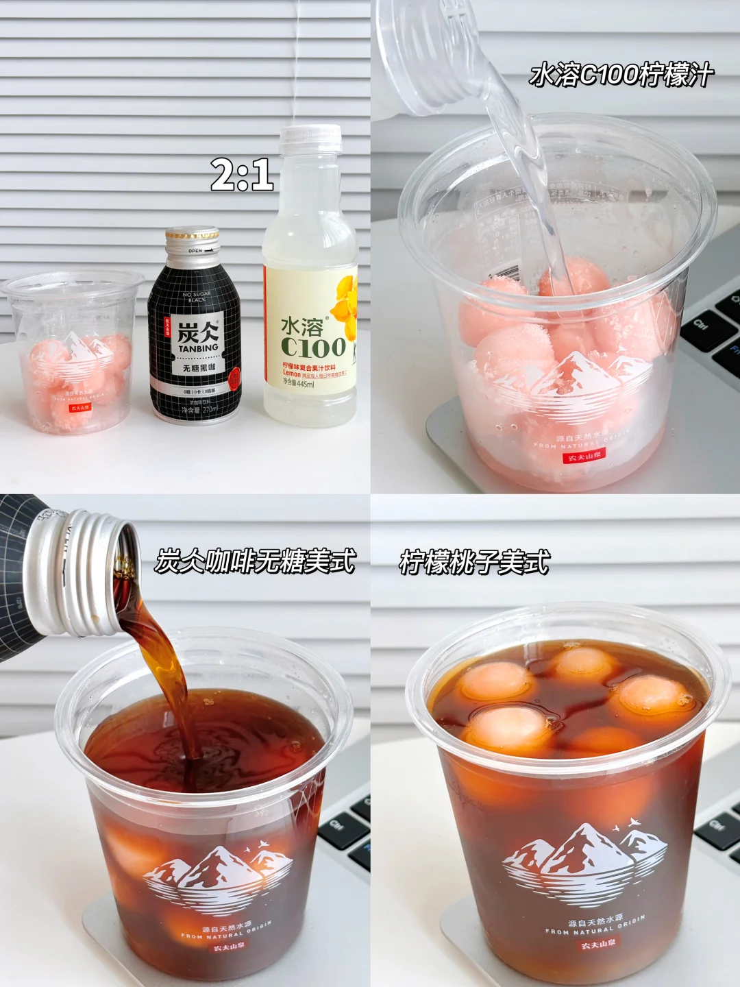 3⃣水溶C100柠檬汁+炭仌咖啡无糖美式+桃子冰球+冰杯,一口下去酸甜适口,果香四溢的🍑桃桃爆柠美式成功!