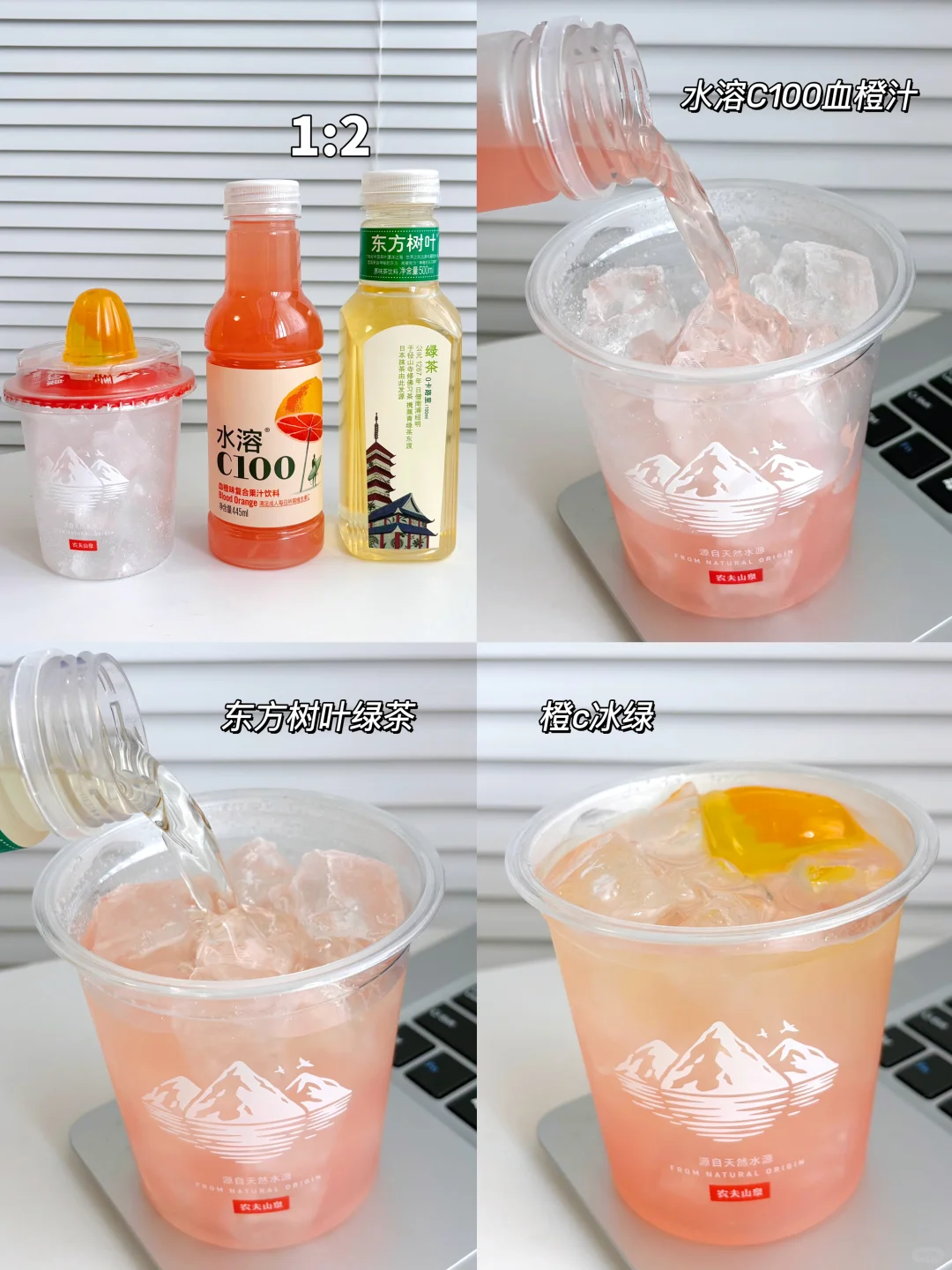 4⃣水溶C100血橙汁🍊+橙子味果冻+东方树叶绿茶🌱=橙C冰绿,香橙配绿茶,浓郁的果味茶在口腔里弥漫开来~